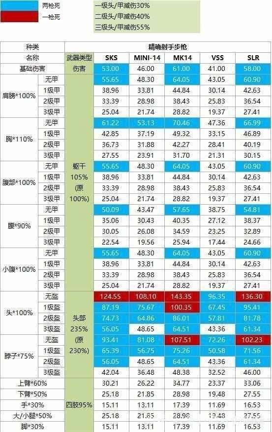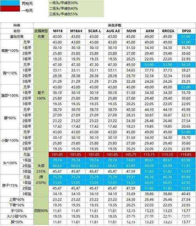 下面是游戏中常用枪械的伤害列表,大家可以记下自己喜欢用的枪械在击中敌人过后,不同部位,不同防具的具体伤害。