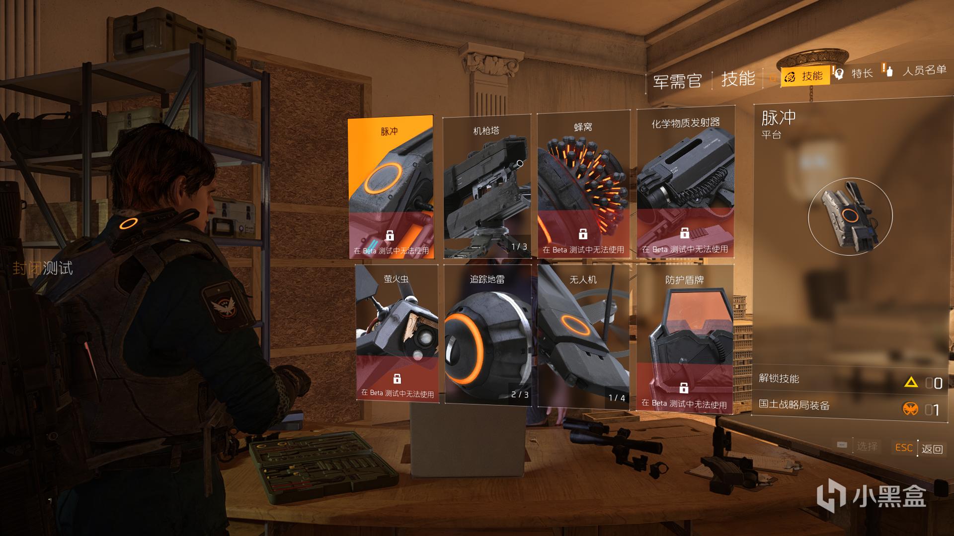 技能体系和前作有不小的区别。《全境封锁2》的角色技能共有8类(私享Beta测试只开放3类),需要在行动基地的军需官处花费SHD点数取得:完成主线任务和收集任务都能得到SHD点数,SHD点数实际上就是技能点。每一类技能有若干种变种,技能装备还有配件插槽,但技能装备插槽尚未开放。可以预见的是技能机制将变得更加复杂。