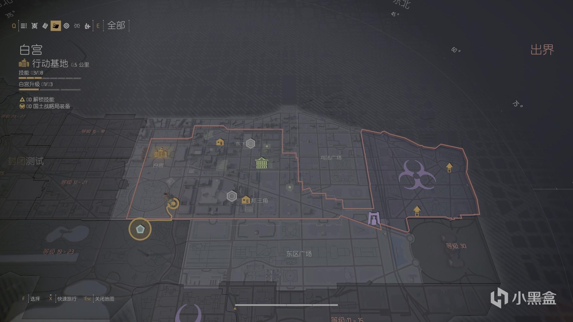 目前开放的区域分别是东下城区(East Downtown)、联邦三角(Federal Triangle)与东部暗区(East DZ)。我们没能看到华盛顿特区的全貌,但按照比例来看,这次的游戏世界确实要比曼哈顿更大,各个副本之间的距离动辄几百米。于是制作组设计了数种可快速移动的落脚点,一来能够满足不同的功能需求;二来也方便了玩家的活动,玩家可以更为轻松地在短时间内到达游戏世界的每个角落。