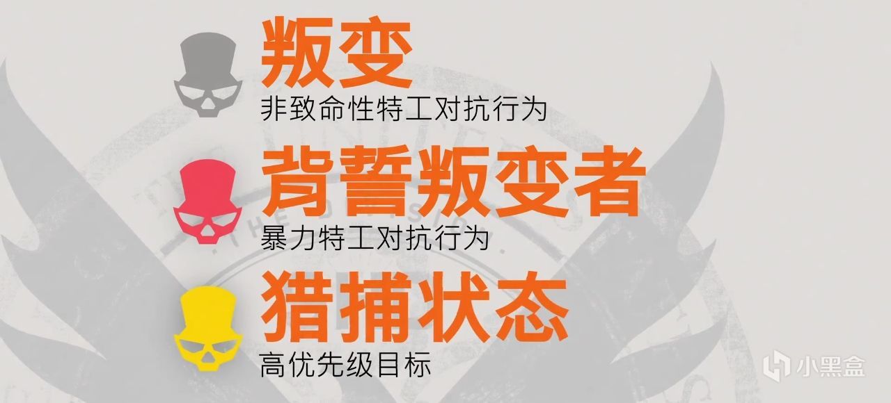 不过,叛变特工的设定进一步得到了完善,有别于前作的击杀特工即叛变,本作中叛变分为三个等级,从低到高分别是叛变(非致命性特工对抗行为,如偷窃和骇入)、背誓叛变者(暴力特工对抗行为)与猎捕状态(高优先级的目标,血债欠得太多)。