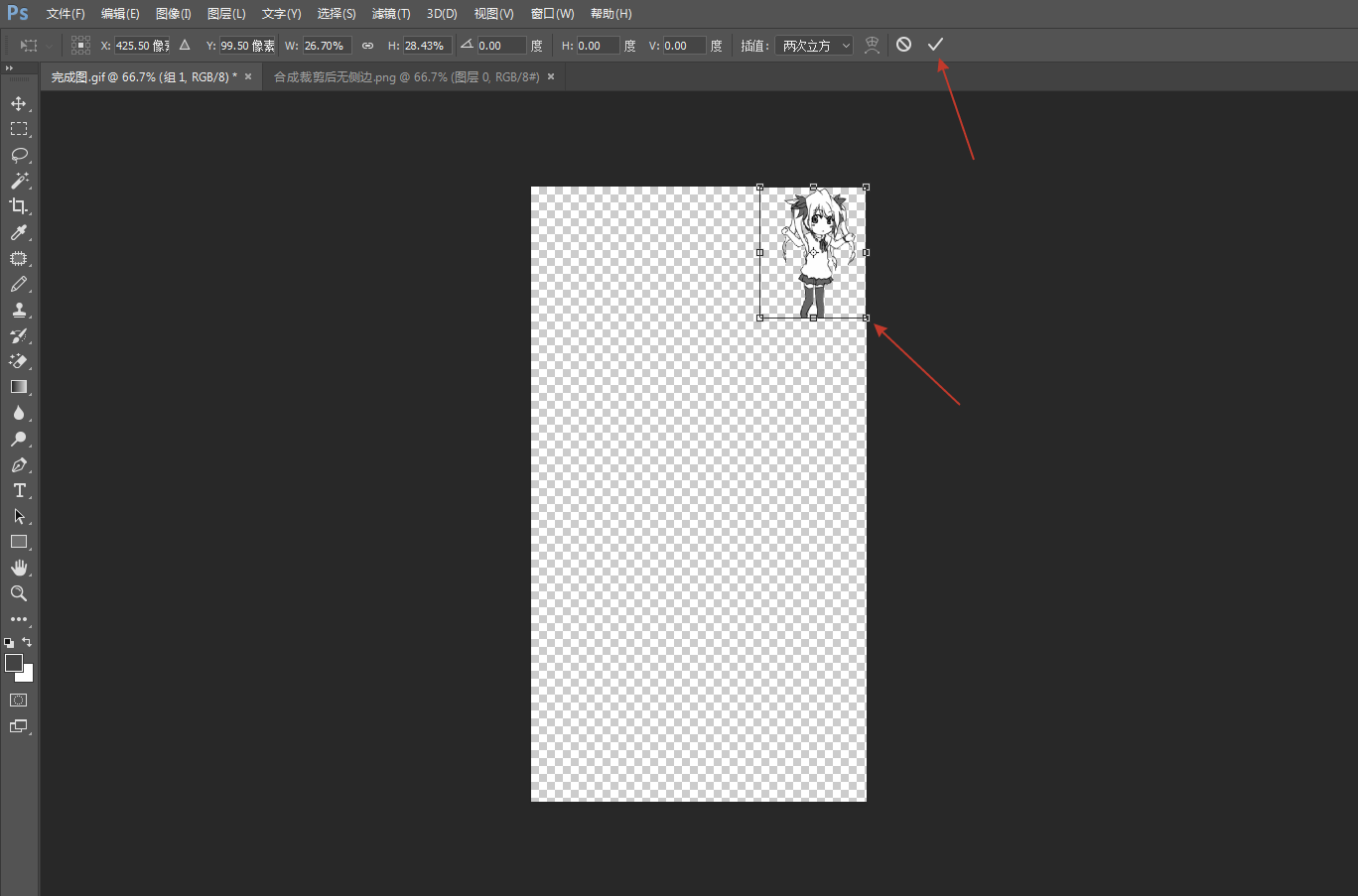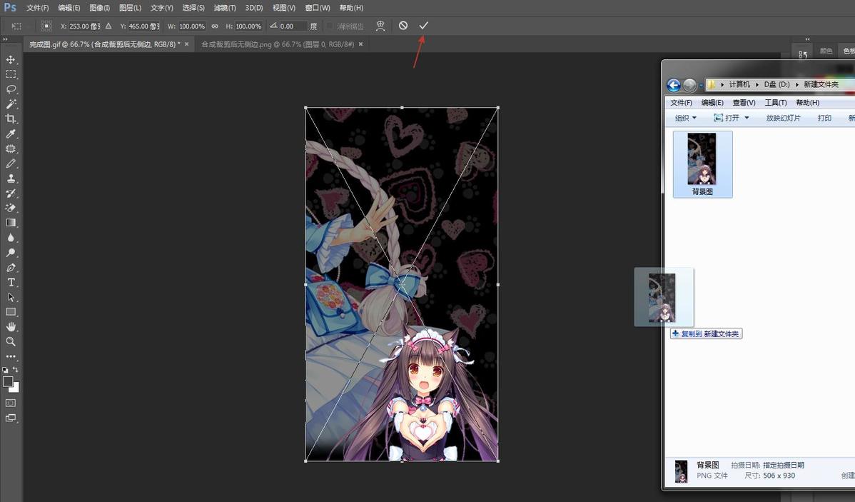 完成缩放和移动后,将背景图移动到画布正中央,点击√