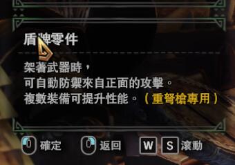 盾牌零件可以在重弩非射击(包括前摇、射击瞬间和后摇),非换弹、非收枪掏枪、非使用特殊弹种、非扩散弹瞄准、非龙击弹蓄力过程中对正面180度范围内的攻击进行自动防御,实战中可以通过举枪瞄准来调整防御角度。针对该零件不做过多介绍,仅说一下我的个人经验:一般情况下插一个盾牌就足够了,剩下的交给防御性能和防御强化(带盾的话强烈建议带防强)即可。