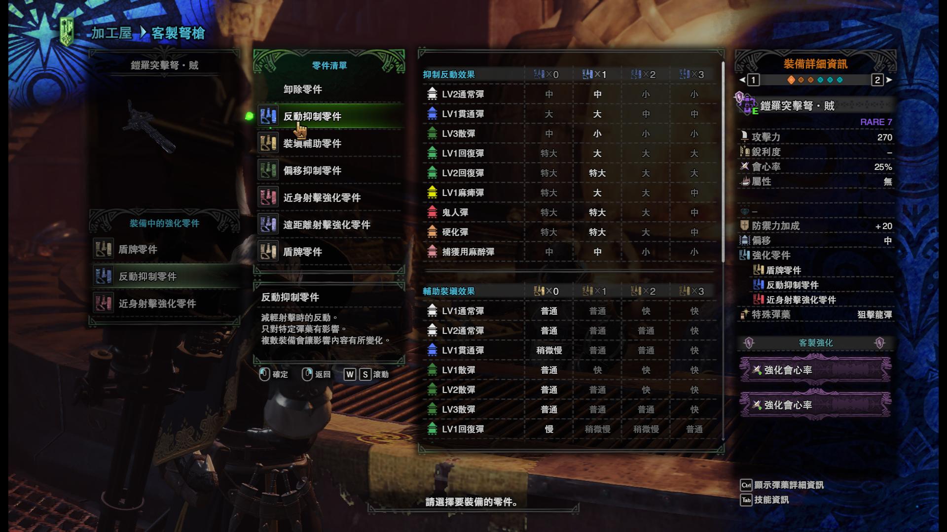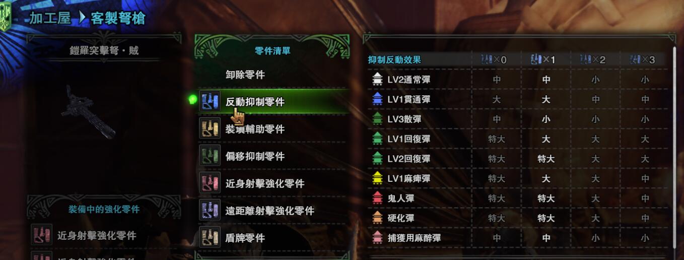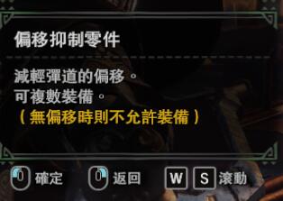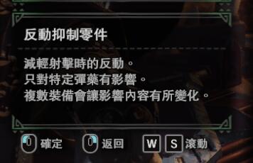 以铠罗突击弩·贼的散弹3为例,默认无零件状态就已经是反动中了,但是只需要一个零件就能降到小,这样能提高重弩的灵活性以及射速,同时只耗费一个槽位意味着客制代价很低,所以完全可以插一个反动抑制零件提高该重弩的性能。