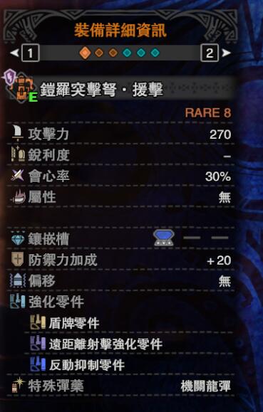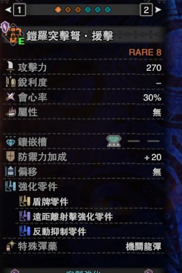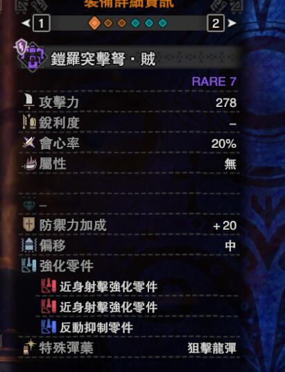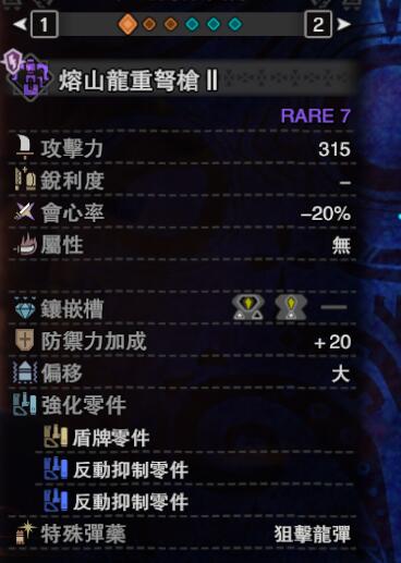 ps:扩散弹流派的黑暗左右/熔山龙重弩枪2客制比较随意,扩散弹不吃任何零件的加成(吃装填辅助,但是仅对扩散弹2有效,较为鸡肋),推荐3近身来提升龙击弹的伤害,或者3盾牌能在非扩散弹瞄准状态提供防御效果。