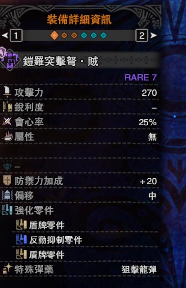 至于为什么不在乎装填速度,主要原因有两个:1、需要三个零件才能使散弹3的装填速度变为快,而我们安装盾牌后只有两个槽位,所以不够了。2、金贼弩属性解放后能射击8发,很明显的就能看出,理想的射击后摇与装填次数的比例为8:1,谁的收益更高就不用我多说了吧。