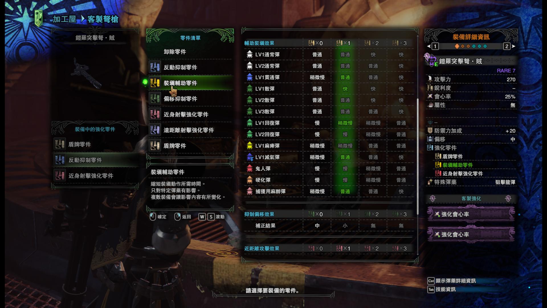 总结一下,装填(换弹)慢和稍微慢会导致猎人在原地装填,产生巨大的硬直,无法边走边换弹(走装),换弹普通和快是可以移动换弹的。这里总结一下客制思路,其实装填客制在很大程度上是可有可无无所谓的,因为不同的弹种有不同的要求,对走装要求较高的弹种,例如散弹、贯通、通常建议客制到普通以达成边走边换弹,对走装要求低的弹种,例如扩散弹则不需进行该方面的考虑。