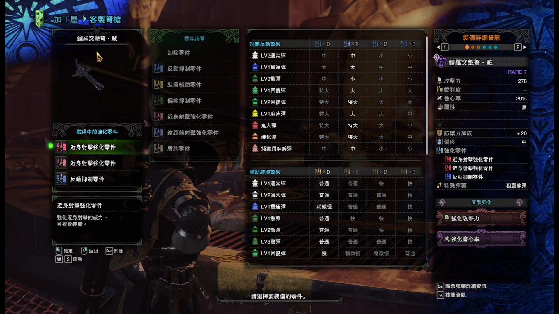 默认情况下散弹3的反动为中,装填为普通,还记得我们之前说过的反动越小射击后摇越短吗?为了避免在射击后摇过程中盾牌失效,所以我们首先应该减少后摇,而通过表格就会发现散弹3只要一个反动抑制零件就能达到反动小,完全满足我们的要求。