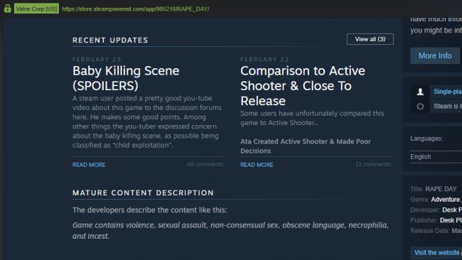 而《强奸日》已经引发了抵制:在Steam游戏的论坛中有几条讨论串都是在呼吁移除这个游戏。然而,这款游戏是否符合Steam有关游戏引战的定义还是个未知数,同时也说明令人焦急的不是游戏内容,而是Valve对游戏的处理方式。在最近的更新中,开发者解释说他们已经移除了一个“杀死婴儿的场景”来避免被指控“侵犯儿童内容”,这也是最容易和法律联系上的一个条例。
