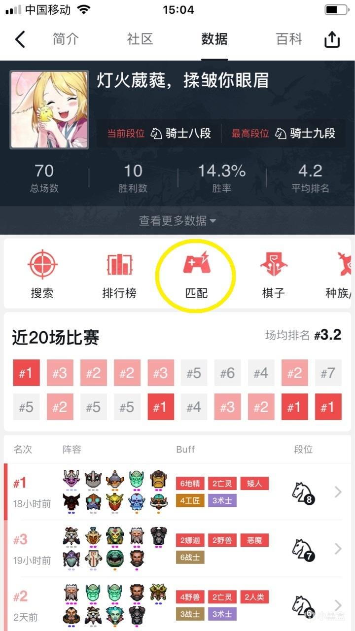 匹配入口位于数据页中部功能列表(骑士八及以上可见,以下段位不可见)。