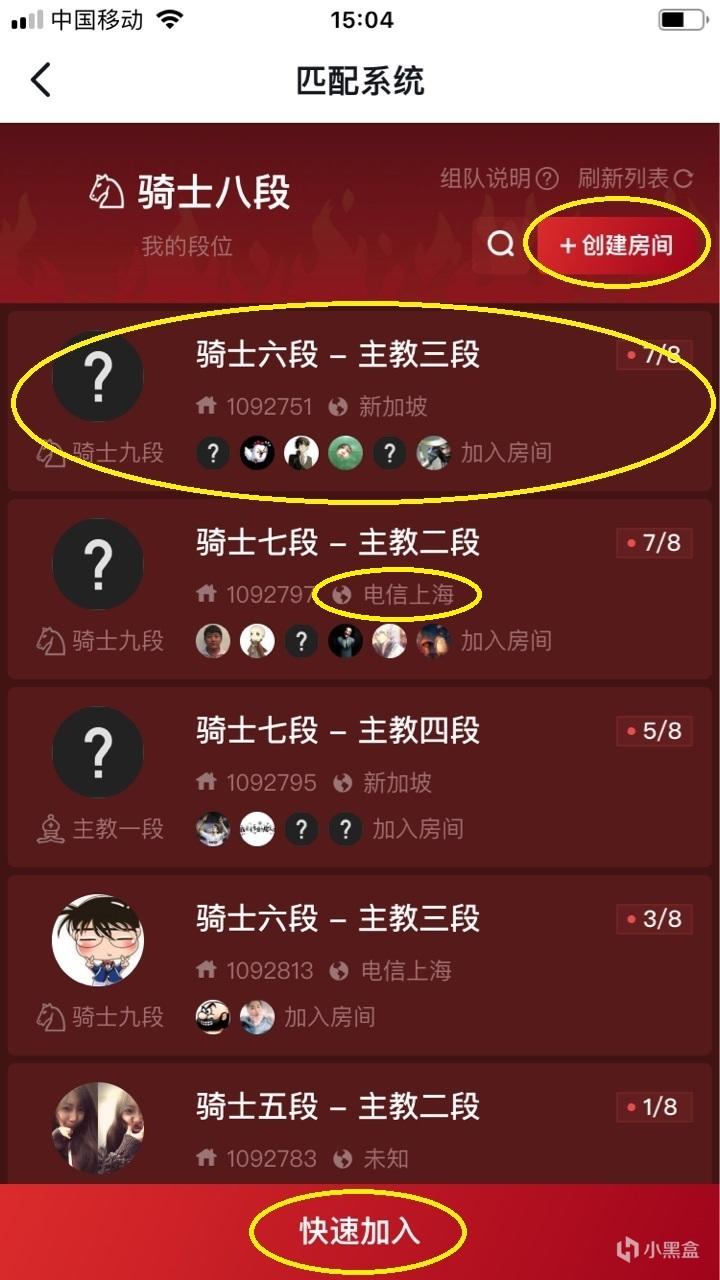 匹配大厅示例如下,三种进入匹配房间的方式为:1.点击“创建房间”,成为房主邀请其他玩家游戏。2.直接点击列表中房间进入。3.点击下方“快速加入”功能匹配房间(由系统自动分配)。房间列表中会显示服务器明细,国服(联通/电信)&外服玩家请按各自情况选择。