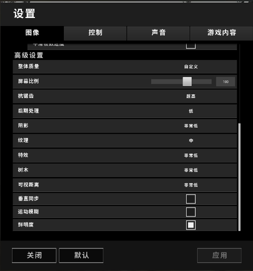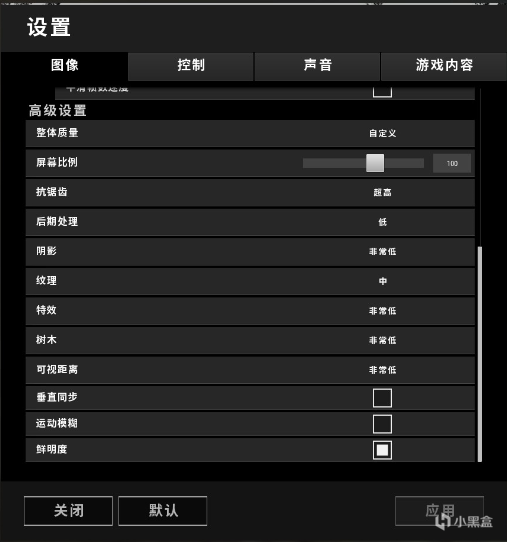这就是我的设置,也是推荐设置,垂直同步,运动模糊全关,会造成移动的物体变模糊,自身移动时视角变模糊。鲜明度打开,作用最大的画面调节,不开的话任何东西都没有轮廓哦!