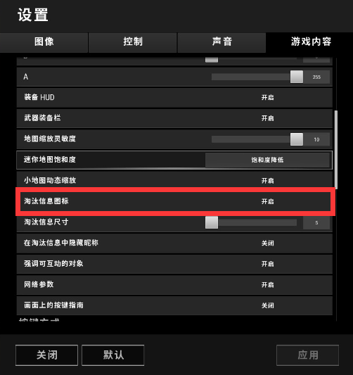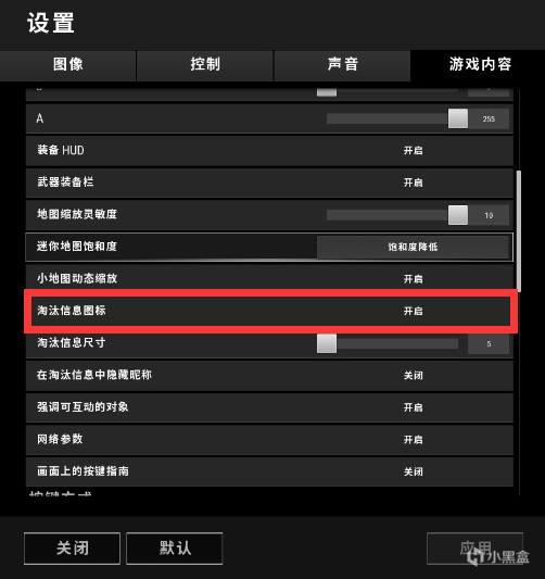 这个选项开启后击杀信息会变成枪械的图片,看个人喜好。举例子,关闭后是A用M4击杀了B,开了后就是A,然后M4的枪械图标,B。