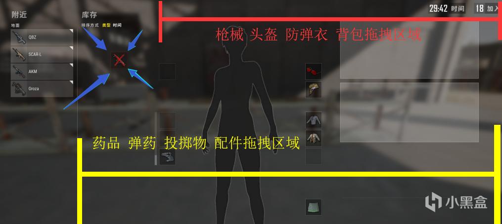 在拖拽时药品,弹药,投掷物,配件什么的要拖拽在黄色区域才有效,而枪械,防弹衣,头盔,背包这些东西是要拖拽在红色区域才有效的,不然会像图中一样出现一个叉的。这就是许多小伙伴捡枪时疯狂拽却只能拽进来子弹的原因。 - 于是总结到前面的知识点我们得到了一个最快的捡枪方案,1当枪械大部分暴露出,可以直接按F捡到时按F捡枪,然后迅速打开TAB拖拽子弹。2当物资过多枪械不明显时,走到枪械上方打开TAB,右键枪械然后拖拽子弹。