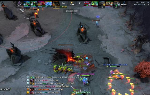 KG在天辉方,J.Storm在夜魇方。KG选出了纯打架杀人推进的阵容,核心编织者、帕克、末日使者,辅助莱恩、拉比克,需要滚雪球杀人拿塔。J.Storm选出推进阵容,核心巨魔战将、瘟疫法师、石鳞剑士,辅助祸乱之源、暗影萨满,中期推进能力足,只要赢一波团,就有推平的可能。