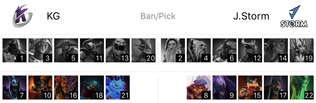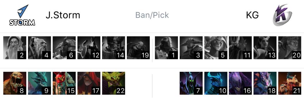 J. Storm在天辉方,KG在夜魇方。KG继续打架推进阵容,剃刀、斯拉达、巨魔战将三核心,辅助拉比克、祸乱之源,相当针对J.Storm的噬魂鬼。J.Storm选出噬魂鬼、拉席克、剧毒术士占线推进三核,辅助天涯墨客、术士,线上要是被压制,很可能一蹦到底。