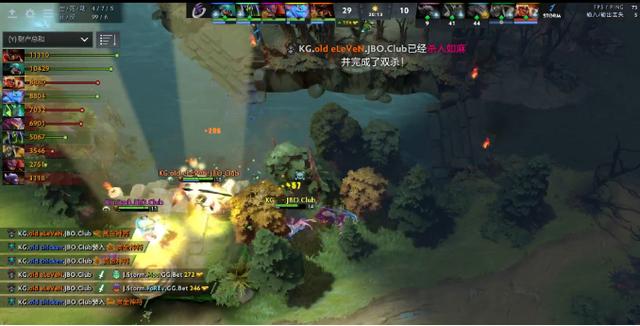 20分钟,拉席克带双酱油的带领下上路推进,术士大招交在了KG双辅助身上,剃刀、巨魔战将马上过来反打,拉席克加上双酱油阵亡,KG一波0换3,轻松收下肉山盾,经济领先达到13K。