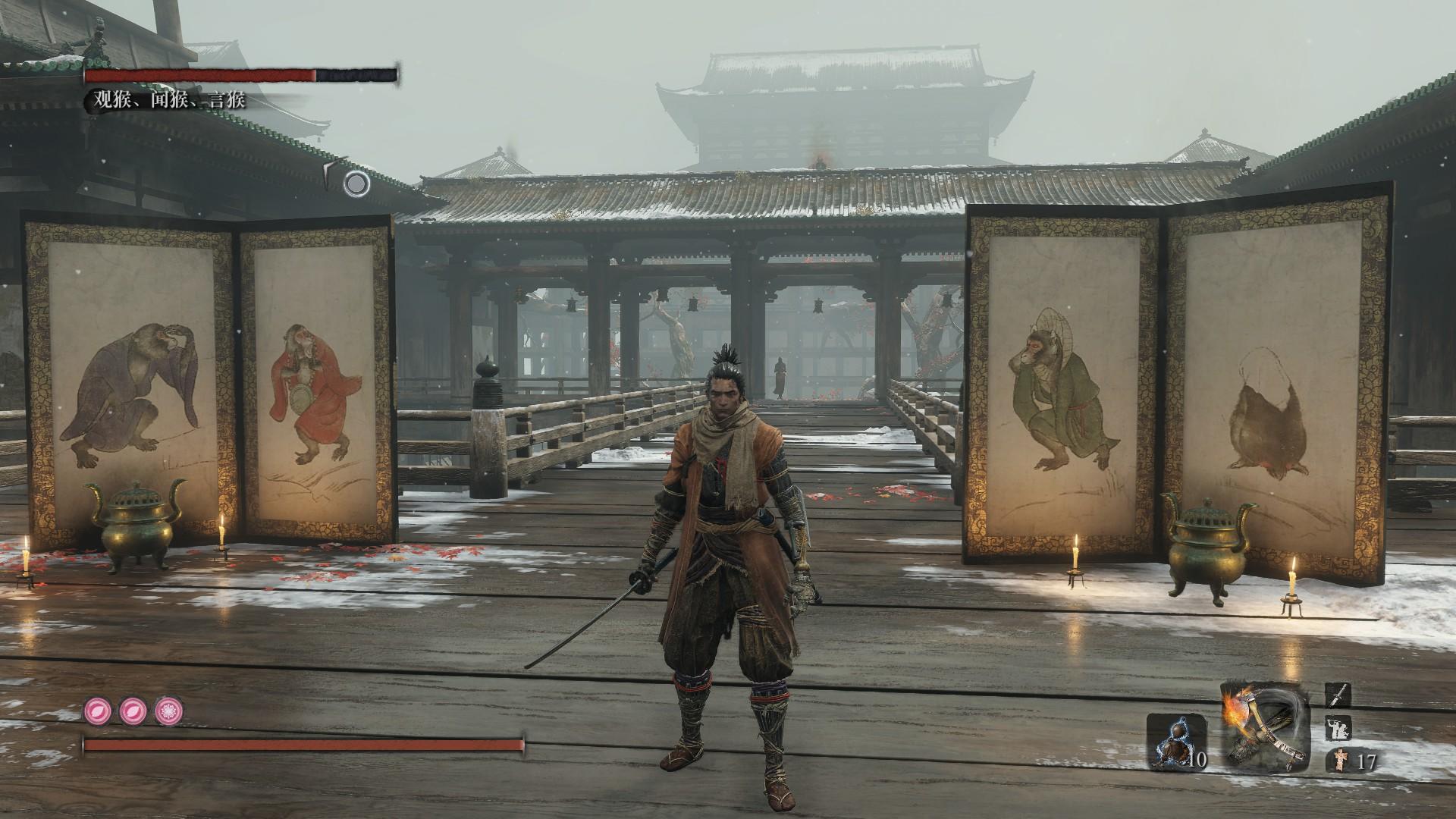 【排行14位——屏风四猴】在仙峰寺主殿桌上的铃铛处进入幻廊,是拿不死斩寻找变若之子的前置BOSS,幻廊位于生死之间,没能成为假龙胤而死去的亡魂在幻廊徘徊,根据变若之子所说四只猴子都是死去的同伴附身操控进行活动的,只是为了保护变若之子而攻击主角(以下统称狼)的,这BOSS毫无难度只需要抓住猴子们就好了,第四只隐身猴通过看房顶的脚步能发现