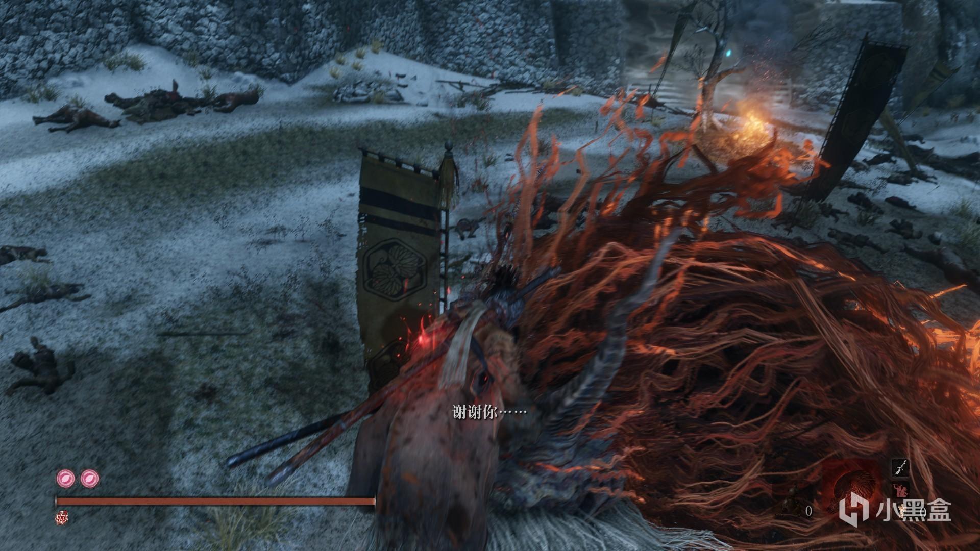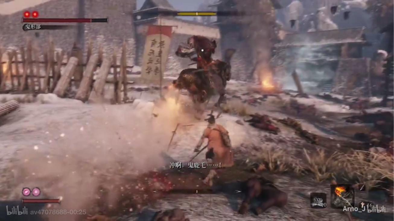 【排名12位——鬼庭形部孝雅】其实倒三这个排名我想给屑一郎那个彩笔。。但客观评价他还是比鬼行部这个新手BOSS强一点。鬼形部,曾经臭名昭著的贼人头目被剑圣一心打败后被招安并成为屑一郎的师傅,手持长枪断角(也就是我们的长枪忍具)胯下一匹鬼鹿毛,好生威猛。(图盗的)打法很简单,再去战场的路上有颗树下有个小兵在一匹死马(名叫小鬼鹿毛)旁边,窃听可知野兽弱炮仗,这也为之后打所有兽型怪埋下逃课打法伏笔。打法比较简单,近身格挡蹭刀,然后跑远的话钩绳攻击就可以了。逃课打法:炮仗忍具(在铃铛老婆婆附件的商人处可以提前购买)