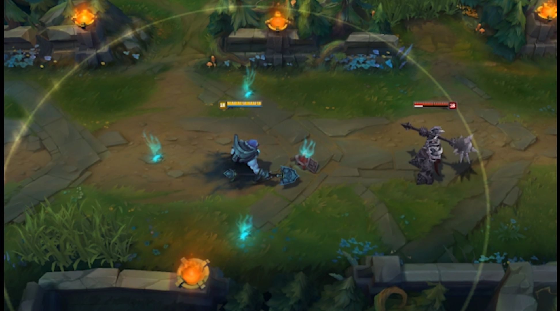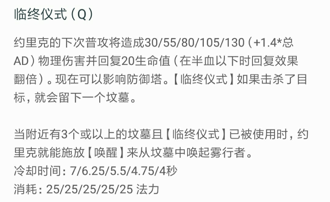 可以看到约里克的Q技能从二级开始基础伤害都要比内瑟斯高,而且约里克的Q技能天然拥有1.4的AD加成,1.4的小技能加成是非常非常高的,整个联盟中比这个加成要高的技能屈指可数。而且约里克的Q技能自带回血,半血以下翻倍,虽然不多且无加成,无成长,但对于六级前的对线也是够够的了。对这个技能没概念的,可以和内瑟斯的技能做比较,在内瑟斯Q被动加成不高的时候,约里克的Q技能只强不弱。比较需要注意的是,身边只要有三个坟墓的且Q技能在冷却的时候,就会由<临终仪式>变成<唤醒>。等到Q技能冷却时间好了的时候又会变回<临终仪式>。这时候如果你需要召唤雾行者你就需要双击Q技能。不过不需要太担心,因为在Q技能变为<唤醒>的时候约里克周围会有一个淡淡的圈,如图所示。