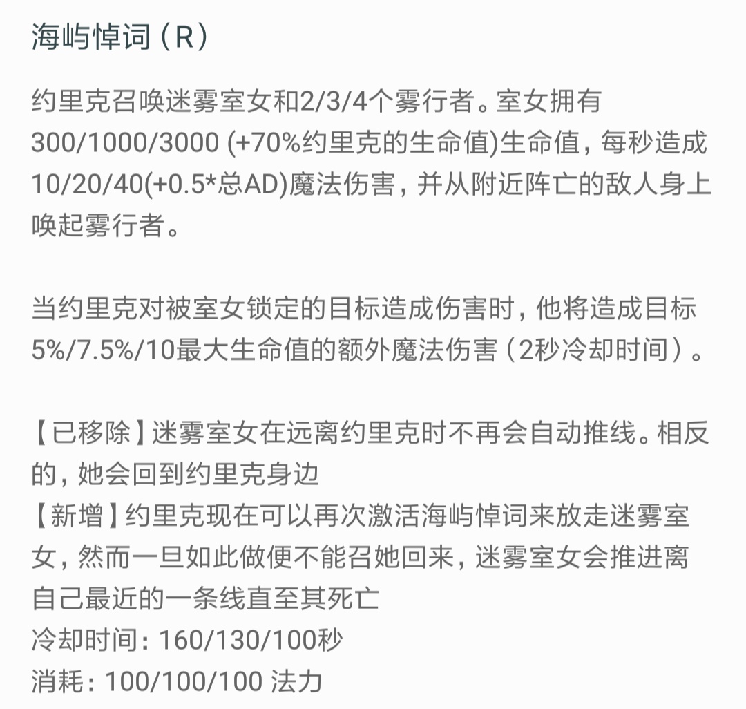 ☞四技能大招是约里克的一个特色,也是英雄联盟现在唯一一个理论上只要使用就可以一直持续到游戏结束的大招。可以说有了大招你就是一家人打一个人,光是秀恩爱都能秀死人(狗头)。虽说这是个玩笑,但也侧面反应约里克大招的强力。可以说有了大招单挑谁都不虚。第一,迷雾室女自身就有不低的伤害,虽然单次伤害不高,但拥有1.0的攻速足以抽死刺客型英雄。第二,迷雾室女可以在周围有单位死亡的时候召唤雾行者,这可以保证只要有兵线,你就可以一直拥有四个雾行者。第三,约里克对迷雾室女锁定的目标造成伤害时可以造成最大生命值的伤害。这是约里克的第二个百分比伤害技能了,还是最大生命值还是百分之十!虽然有两秒的CD,但真的很强很强。你可以想象当你E技能放中某一个没位移的脆皮,一群雾行者和一个迷雾室女冲过去的景象。妙不可言,谁玩谁知道(再次狗头)