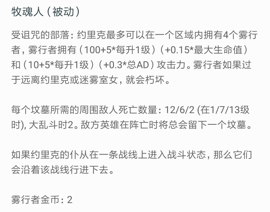 ☞被动技能对于这个技能,可以看到约里克对于攻击力的加成很高很高,单个雾行者的攻击力加成就有0.3的总AD,而且约里克在一个区域内最多可以拥有4个雾行者,每个雾行者拍一巴掌那就是1.2的总AD,比你自己打一下的伤害还要高。而且有一个细节必须要注意,约里克的四个雾行者限制是在一个区域内,而且雾行者在一条战线是进入战斗状态就会沿着该战线行进下去。那么在你的四个雾行者带线的过程中,约里克可以离开较远的距离,去野区或者另外的线路重新召唤四个雾行者。对于技能介绍上的雾行者过于远离约里克或者迷雾室女就会朽坏这一点,在实际情况中这个距离是很远的,而且到后期的必要情况可以利用迷雾室女带线,这在后面会再提到。同时记住7/13两个重要的关键等级,会比较大的影响到你迷雾室女死亡真空期的战斗力。