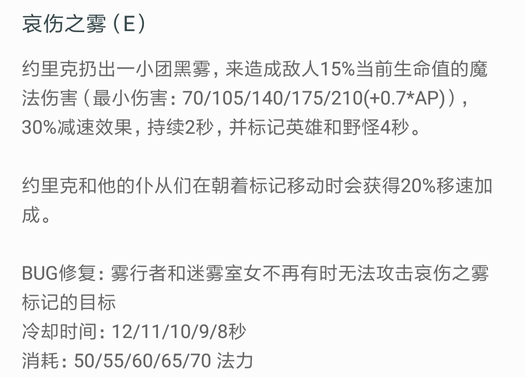 ☞三技能这个技能是约里克最重要的一个技能,某种方面来说比大招还要重要。首先这是一个百分比伤害的技能,同时是一个带减速的软控制。最主要的一点就是你的雾行者在第一次攻击被标记的目标时会跳跃过去,必定打出第一下伤害。而且这时候即使对面英雄交出闪现类技能逃跑,雾行者会跳跃第二下继续跟进。不过需要注意的是e技能的标记时间是四秒钟,所以不建议在对线期越过河道的时候交出你的e技能,因为很容易把迷雾室女带进敌方防御塔的攻击范围造成死亡。至于为什么说某方面来说比大招还重要,是因为没有e技能你的迷雾室女和雾行者的攻击目标是滞后的,也就是说必须在你攻击之后才会攻击你攻击的目标。但是战斗瞬息万变,你能打到第一下很可能打不到第二下,但当你有了e之后哪怕你没有大招的加持,靠雾行者的伤害也足够你一个人切后排。