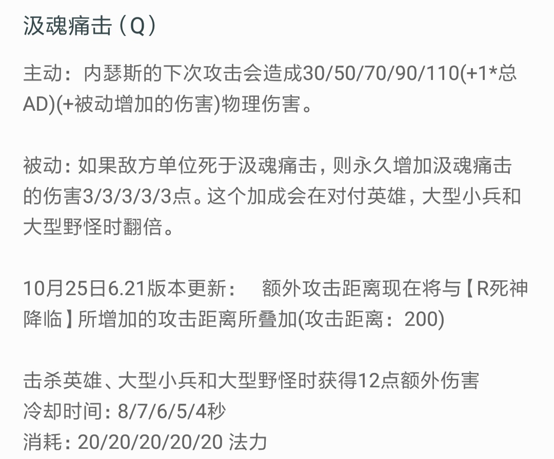☞一技能对于这个技能我们可以和沙漠死神内瑟斯的Q技能加上被动技能做比较学习