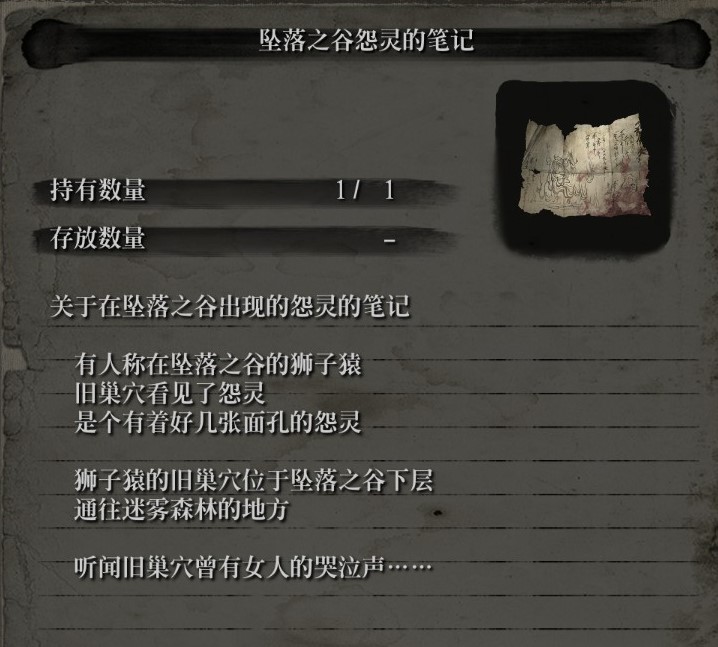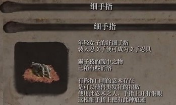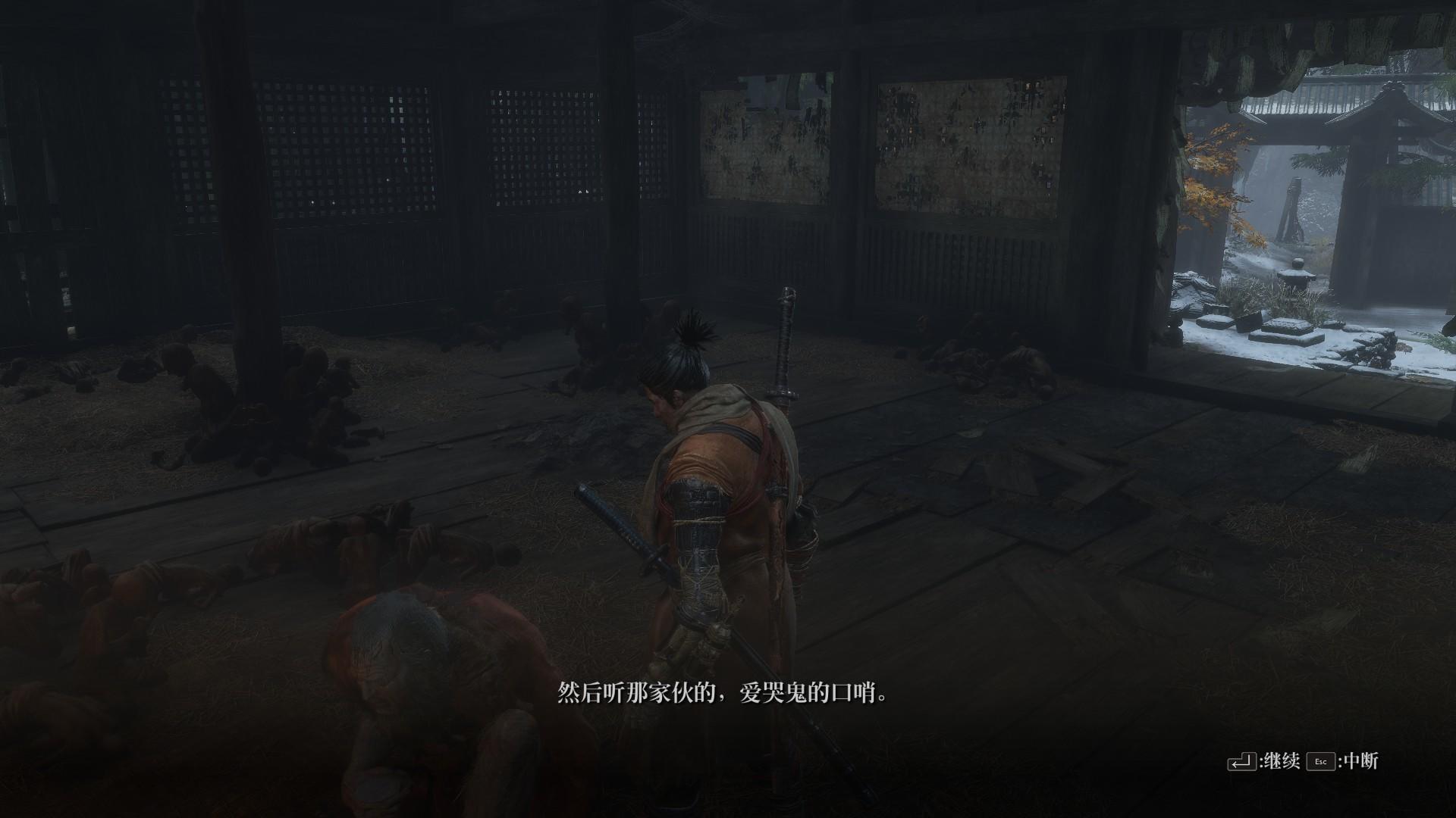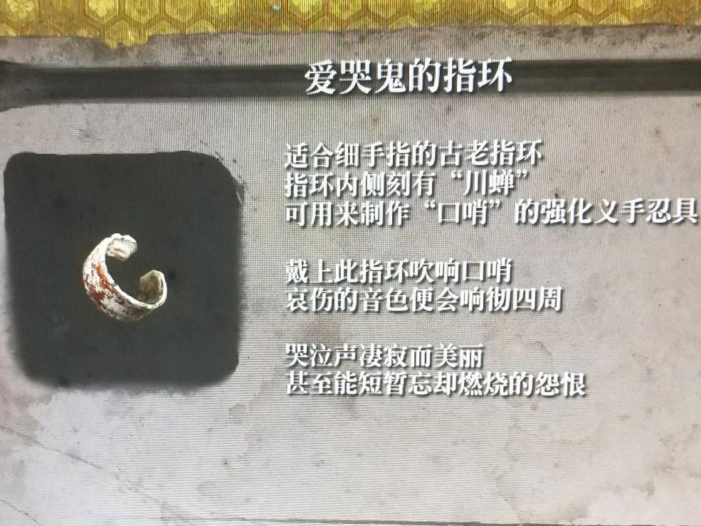 最终不知何原因爱哭鬼与狮子猿同归于尽(脖子上的长刀是爱哭鬼的),这里有个细节就能证明另一名落单忍者就是爱哭鬼:狼击杀狮子猿后会掉落细手指,介绍上说了是年轻女忍者的手指,而当我们回到狮子猿巢穴彻底击杀它后,在情报商人那里可以得到怨灵在狮子猿巢穴的线索,再去巢穴就能看到流程中第二只七面武士,击杀它掉落带着血的爱哭鬼指环,流程共计三只七面武士和五只无首都是由不同原因屈死的怨魂聚成的,所以这里的七面武士很可能就是爱哭鬼。