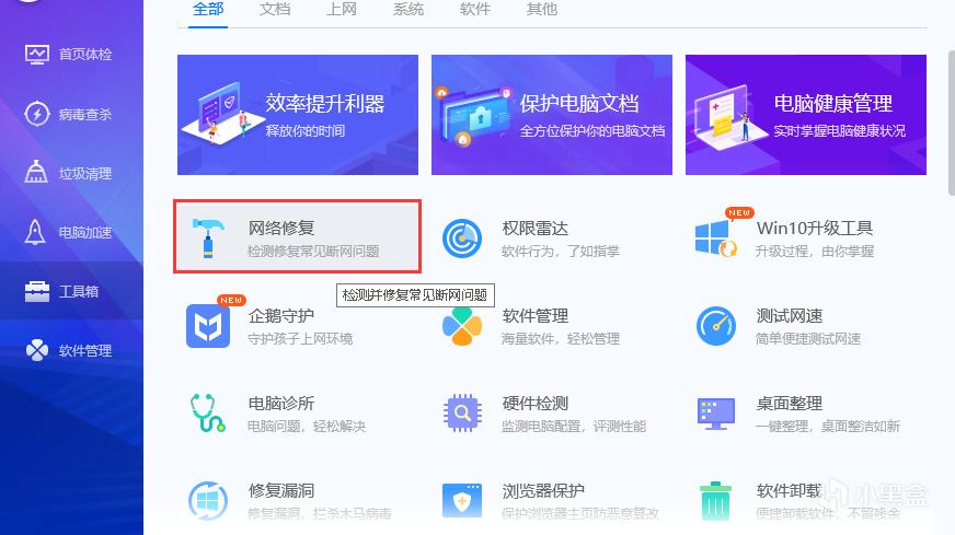 大部分普通家庭用户都会安装下图类似的清理垃圾或杀毒软件,里面也附带了修复网络@hosts@DNS的功能,点击修复即可(下图来源网络)