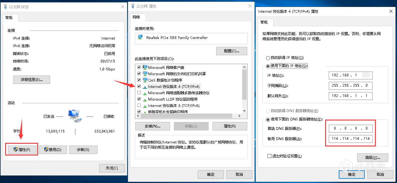 打开属性—进入Internet协议版本IPV4—选择使用下面的IP地址,把DNS改为8.8.8.8或8.8.4.4即可