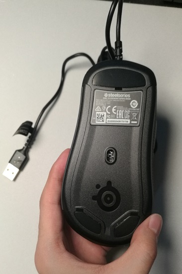 鼠标底部的脚贴是上面一块横向大脚贴和分布在尾部左右形状大小不同的小脚贴,与以往赛睿的鼠标不同,以往的赛睿鼠标都是大小统一的。