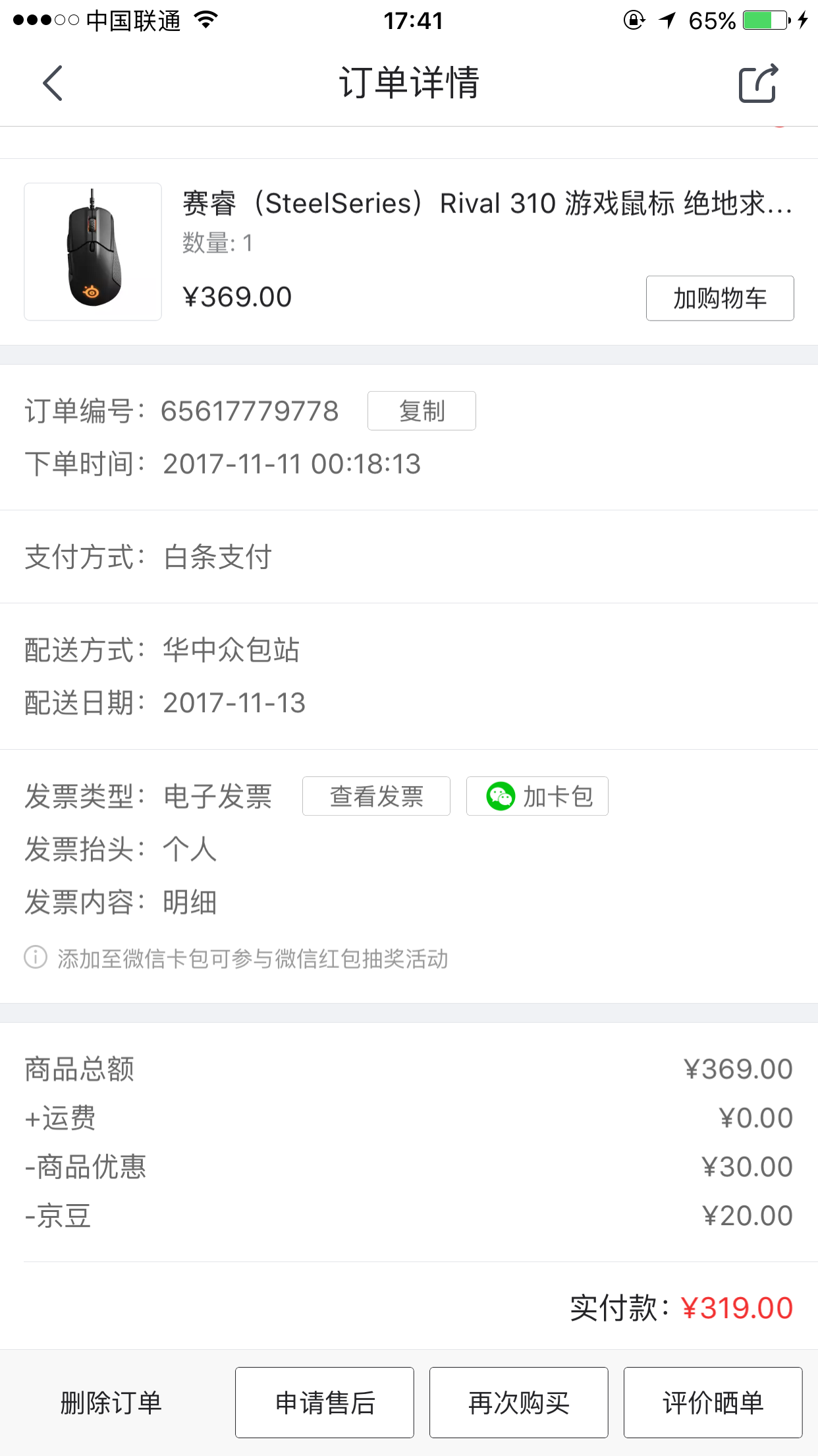 双十一购物大狂欢,为了能更好的吃鸡,我决定买一款新的鼠标换换手气,于是在双十一当天配合减免券+京豆以319元买了鼠标——Rival310。