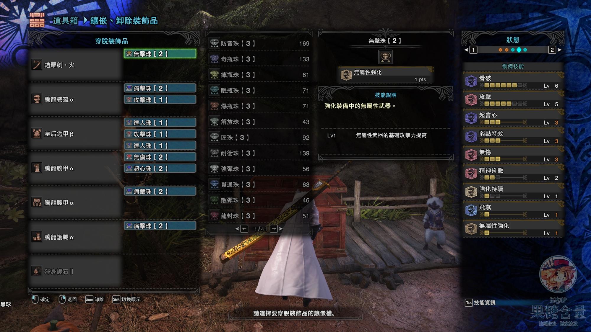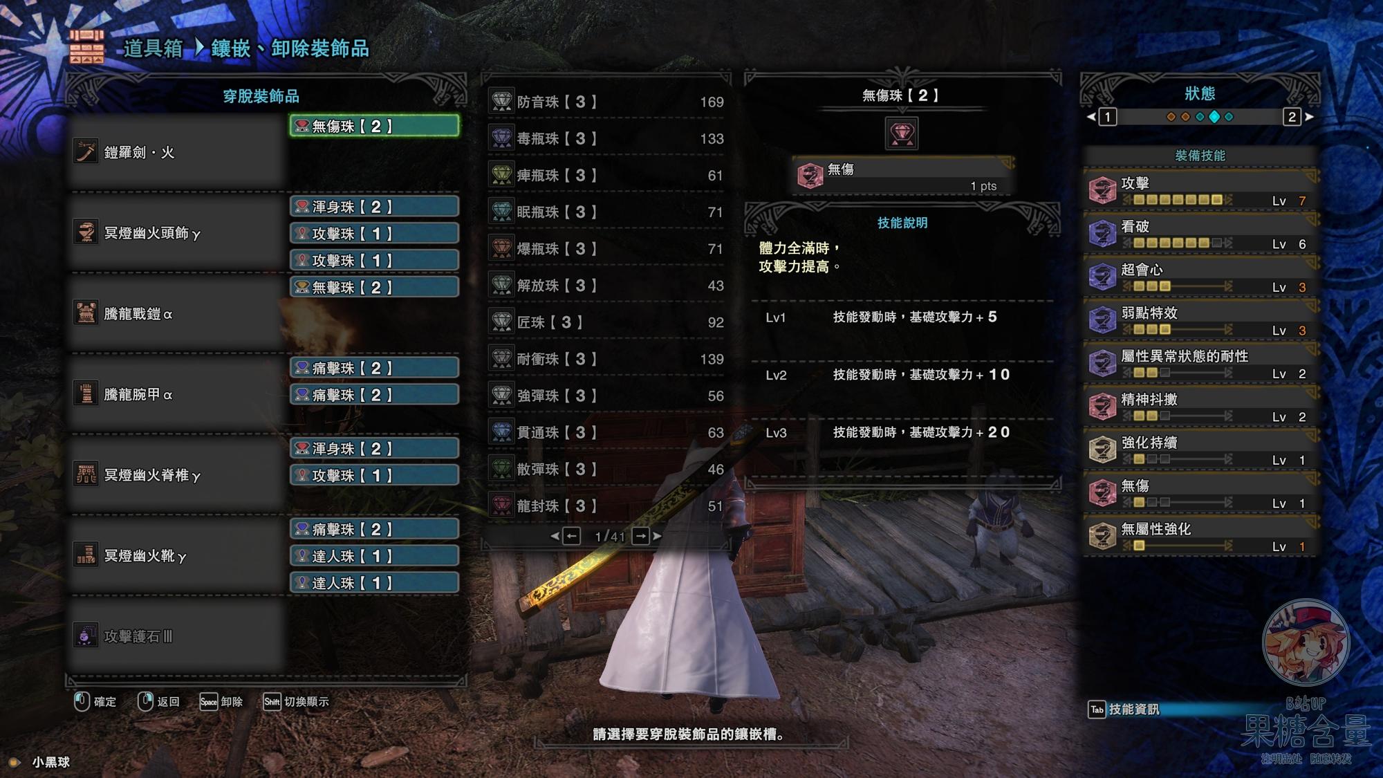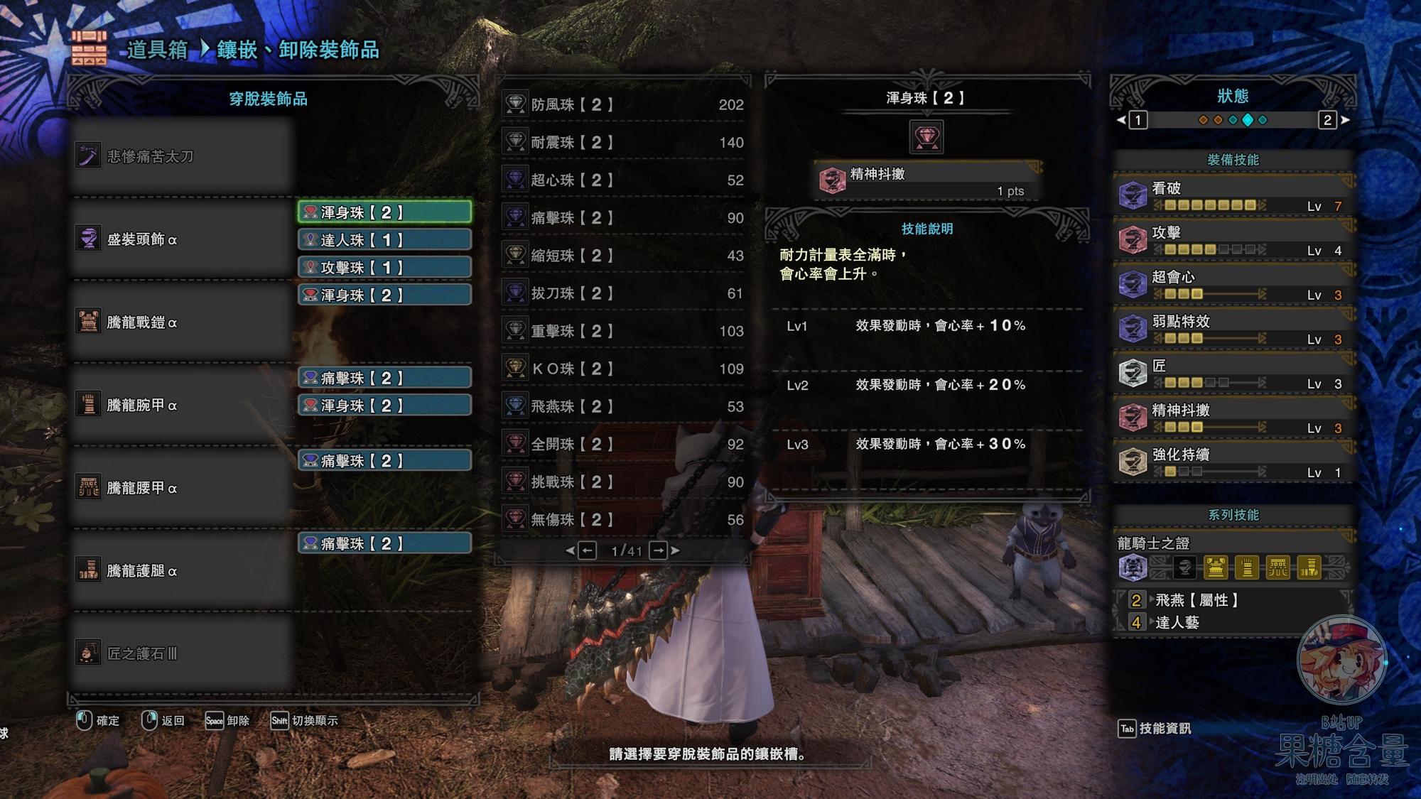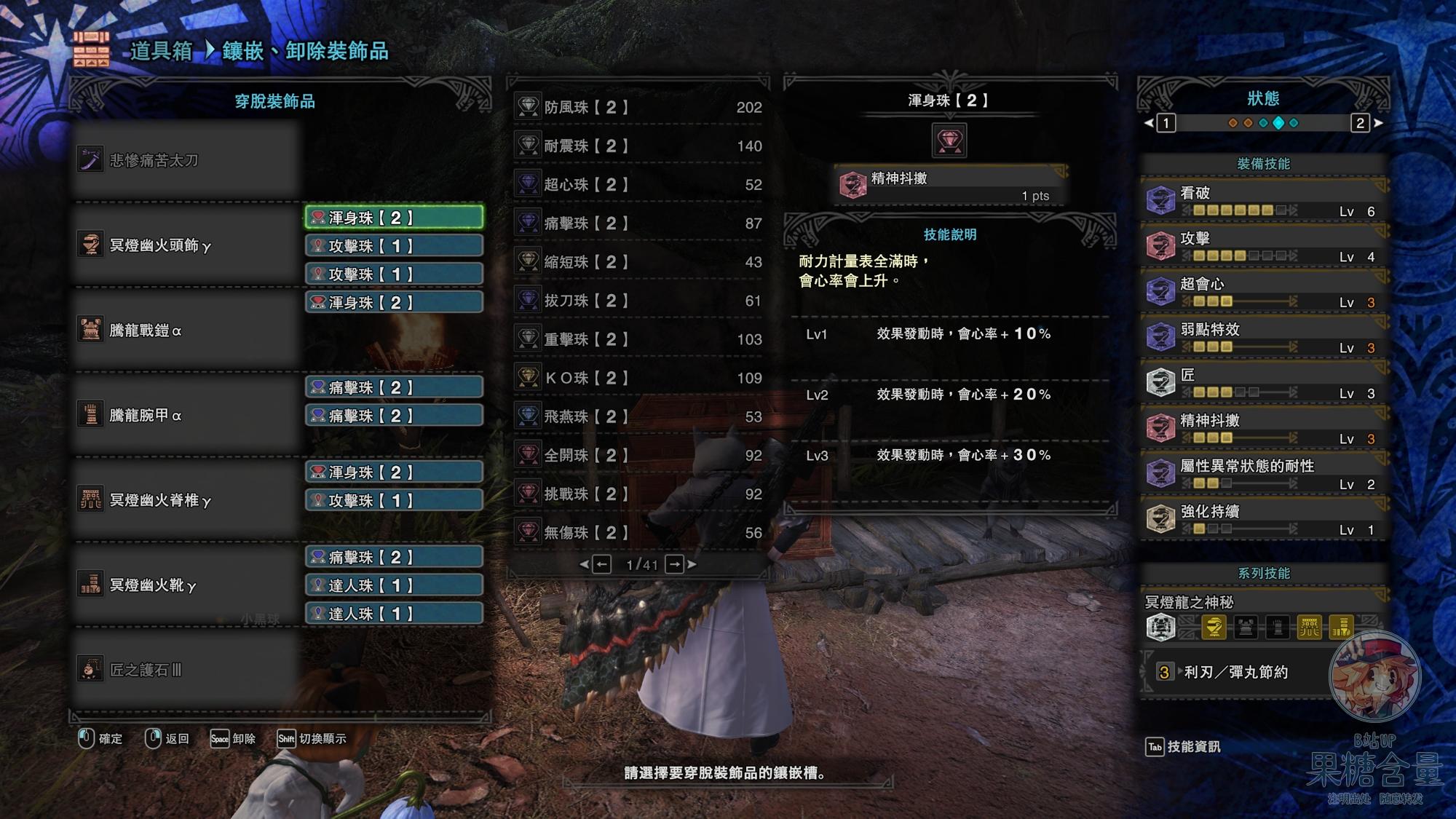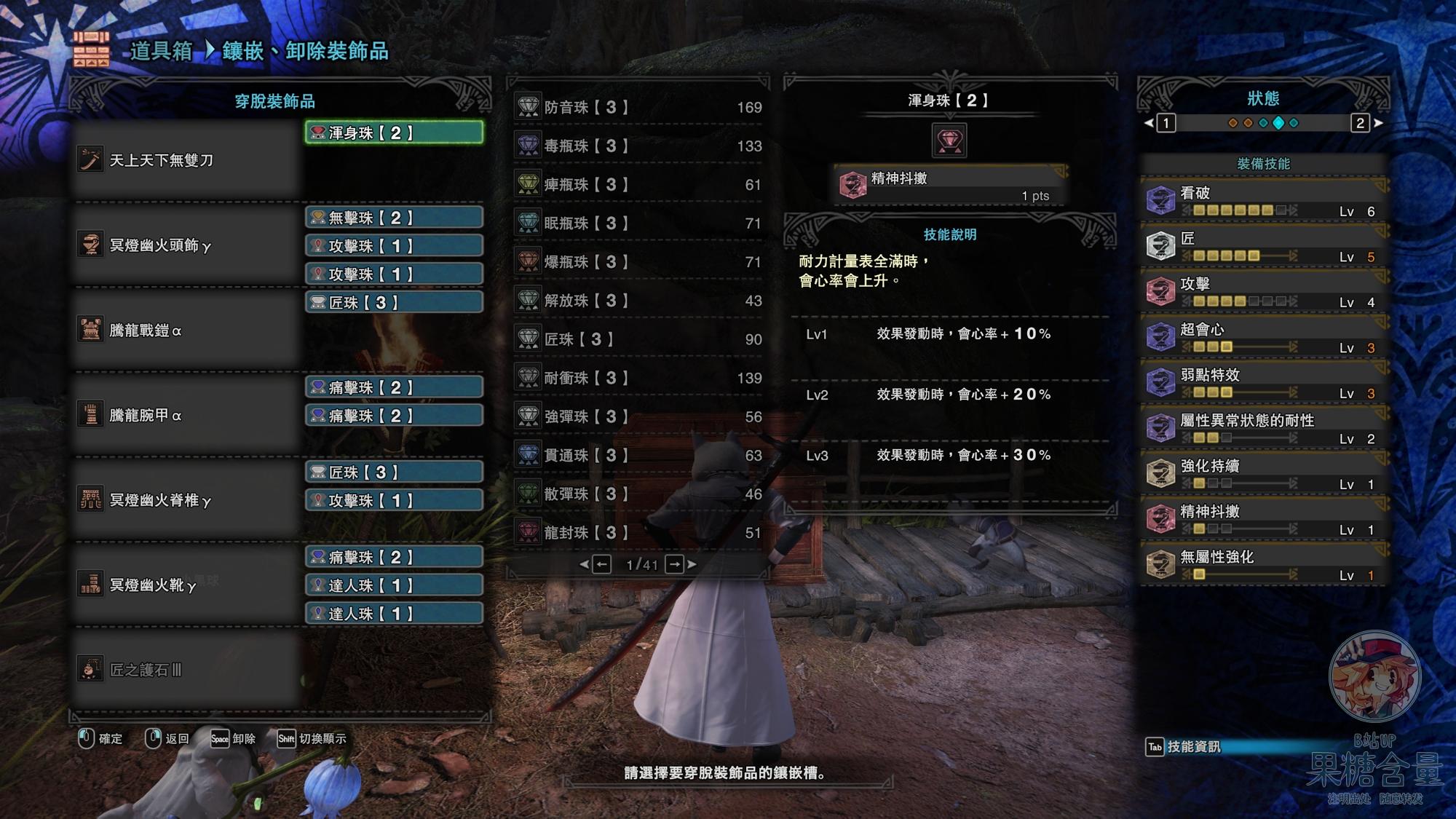 新版本的冥灯龙γ套与熔山龙γ套装对于太刀而言,校服并不会发生任何变化。熔山龙γ就不提了,冥灯龙的利刃效果是斩味消耗减半,但是腾龙套的达人艺是暴击就能够不掉斩味,而通常就算没有触发弱点特效,本身的会心率也会叠到50%,所以几乎可以说达人艺就相当于利刃了。