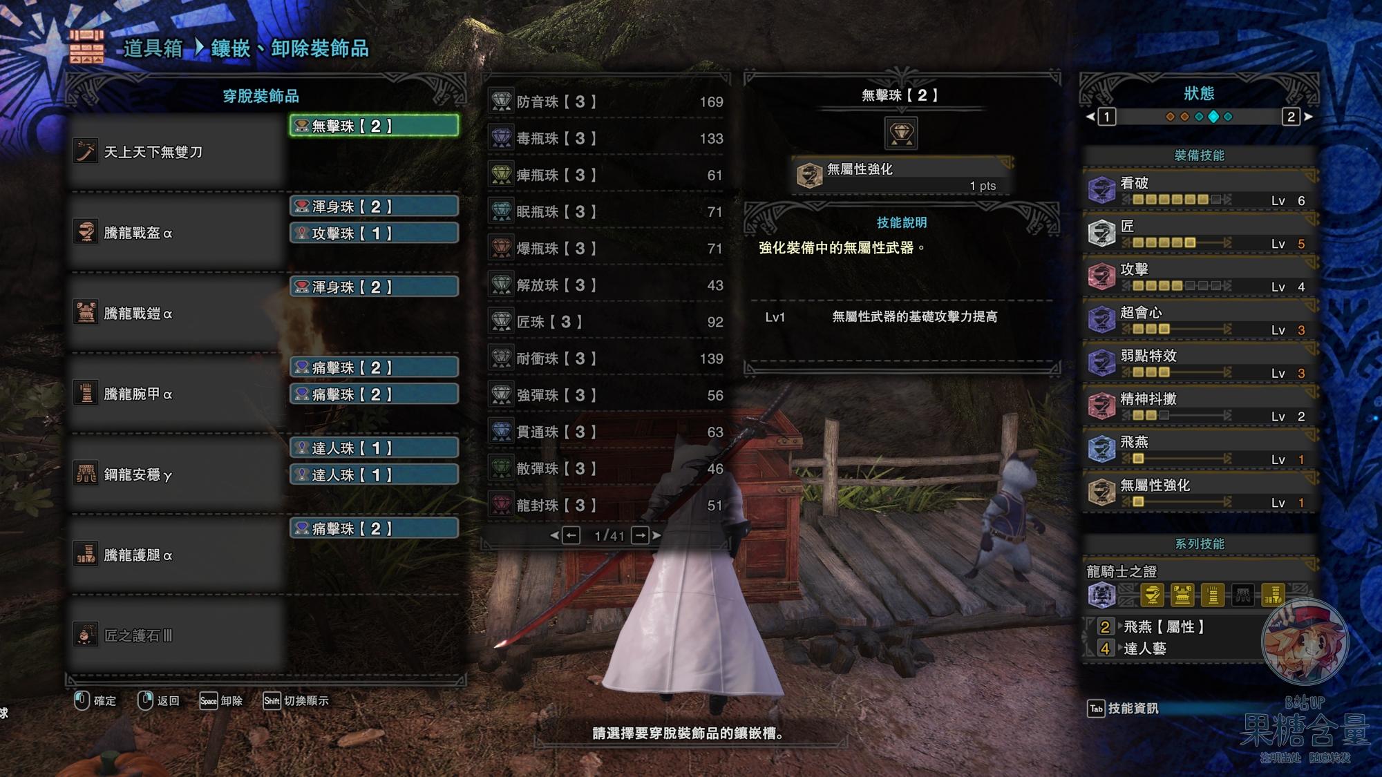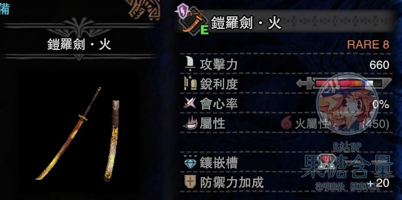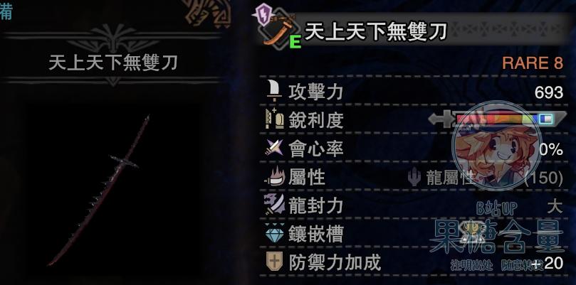 因为天刀的外观有很多人喜欢,因此即便它并非最强太刀,但还是有许多人平常出门喜欢带它,钢龙γ的腰就已经让天刀达到了它自己所能达到的极限,解决了本来没法叠到5匠满会心的问题。从上面的校服配装和下面的利刃配装大家就可以看出来,在伤害相同的情况下,校服的配装会心率是100%,而利刃的会心率只有90%,而且一开始也和大家说过了,就算没有触发弱点特效,达人艺还是有50%的概率能防止斩味的下降,因此利刃配装我是不推荐的。