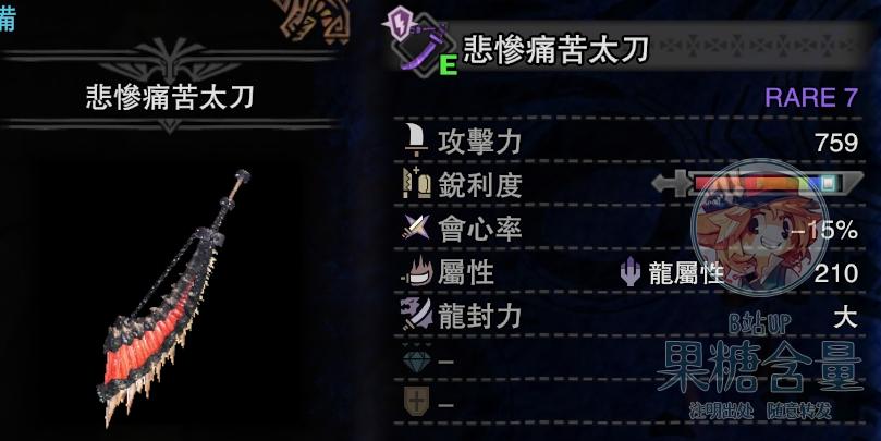 从盛装祭开始,悲惨痛苦太刀的极限也到此为止了,利刃配装同样还是不推荐使用,只是发出来测下数据给大家看看差距罢了,另外应该也有不少童鞋错过了盛装祭,所以没有这个盛装头套,不过其实没有关系,盛装头套是可以直接用战纹头盔代替的,技能配出来还是都一模一样,只是防御力低了一些而已。