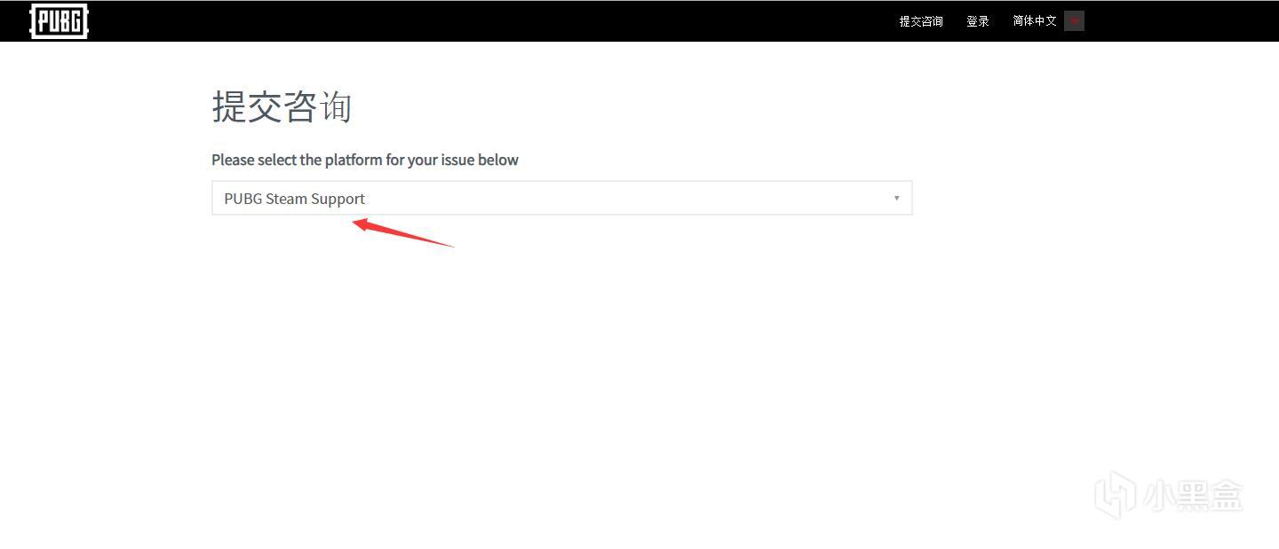 第一步:打开“https://support.pubg.com/hc/zh-cn”点击右上角提交咨询,选择PUBG Steam Support,如图