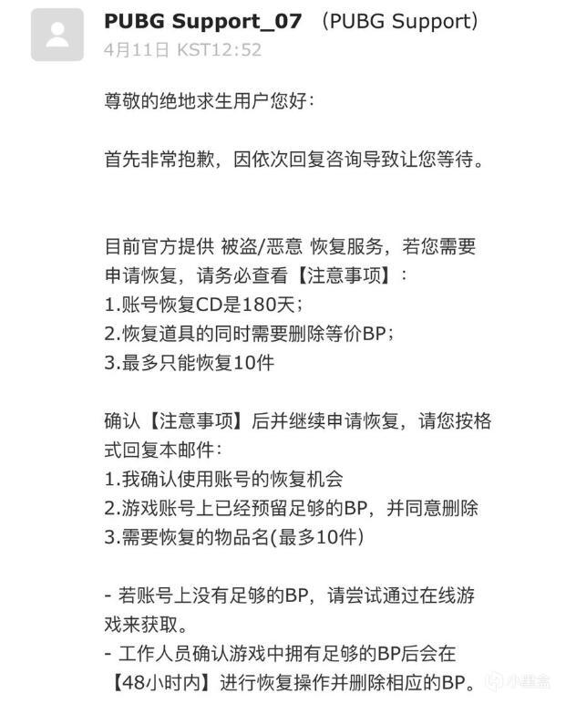 第三步:收到蓝洞的回信,需注意,180天以内的饰品才可以找回,需要同等的BP,最多可以恢复10件,只有一次机会,回复枪械皮肤需要使用标准的英文格式例如:鲨鱼98k叫Shark Bite - Kar98k