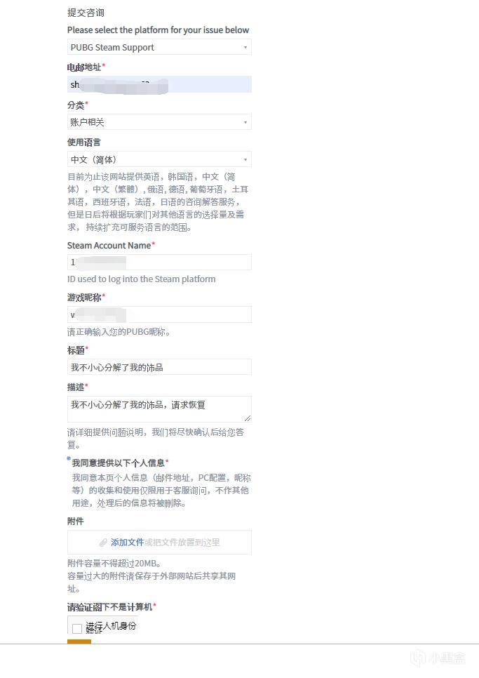 第二步:填写表单,如图,电邮地址就是邮箱地址,分类选择账户/储存(账户相关),Steam Account Name是17位SteamID 点个人资料,超链接栏里面的17位数字,游戏昵称:你游戏的ID,点击进行提交,等待2-4个工作日