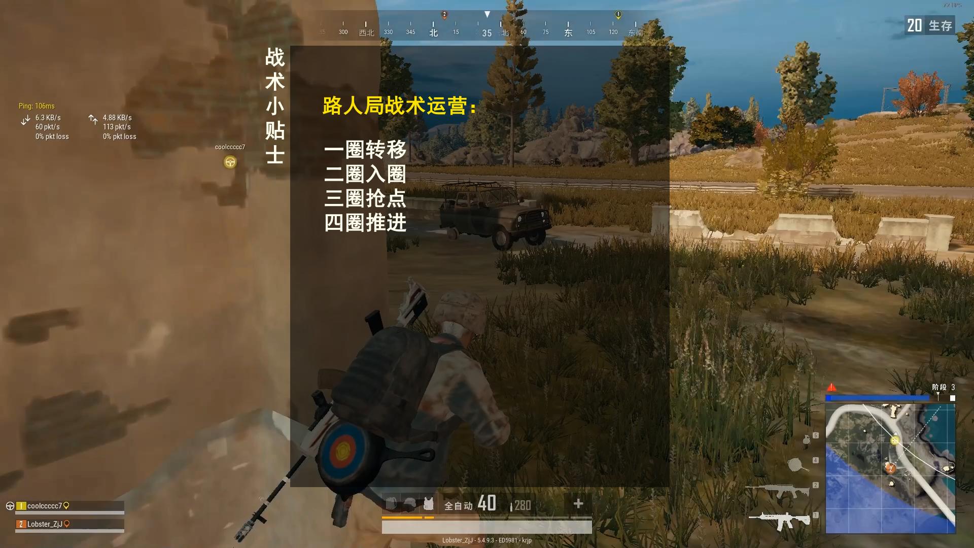 这是一个最普通的战术运营,当然要实际情况实际分析,比如,当你发现,这场比赛存活人数锐减的情况下,可以选择阶段一与阶段二的过程中,吃毒进圈,不用那么着急。而且在大量的比赛中,如果采用吃毒进圈将大大提高吃鸡的概率。