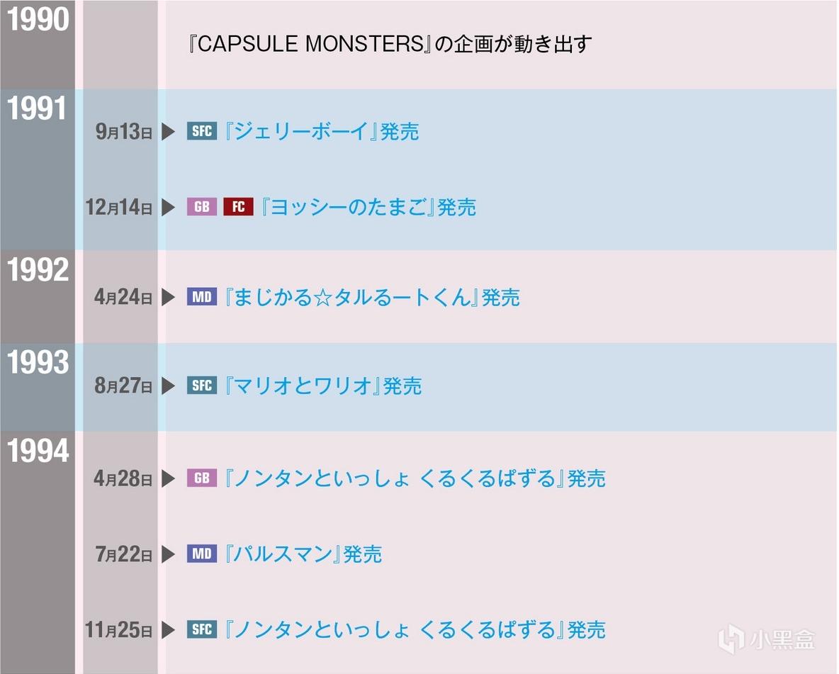 在年表1990年的项里的“CAPSULE MONSTERS(胶囊怪物)”,之后成为了《精灵宝可梦赤·绿》企划的原型。《精灵宝可梦赤·绿》于1996年发售,它的发售不仅影响了gameboy的市场,同时也影响了整个游戏市场。不过,发售前6年就已经有它的企划大纲真是令人惊讶。