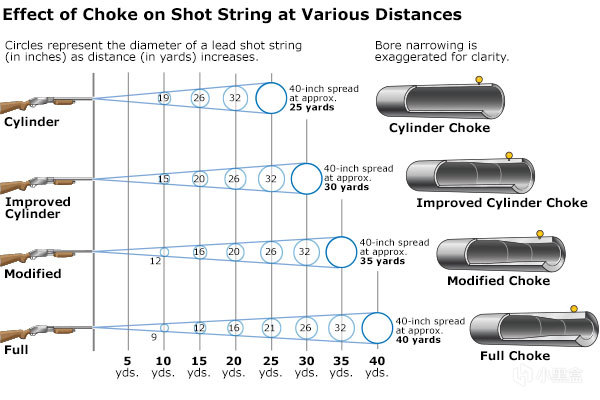 从名字就能看出,“喉缩”是在枪口处缩小枪管直径,让弹丸更加密集的一阵配件。在喉缩的作用下,弹丸射出枪管时的距离更加紧密,在远距离的扩散也随之减小。这样一来就能更准确的命中远距离目标。特别是在射击鸟类或飞盘靶时,喉缩是一种极为重要的配件。