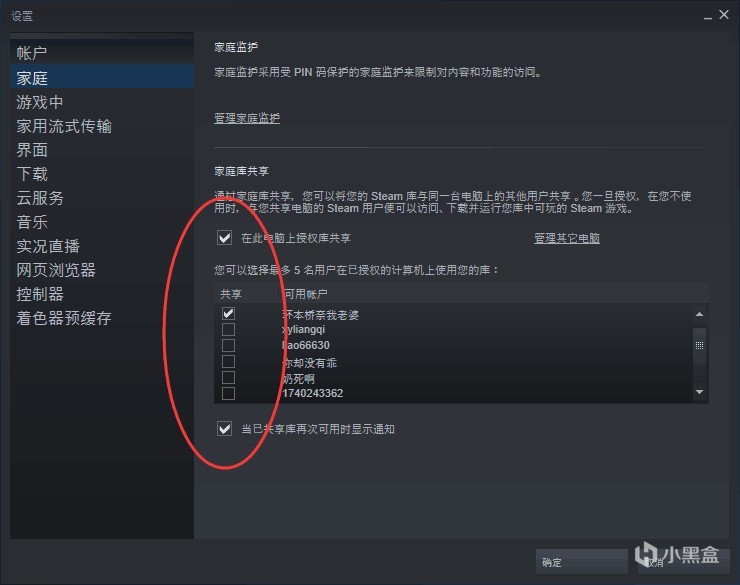PS:.最下方的当共享库再次可用时显示通知的作用为,当共享者没有使用游戏库时会对被共享者进行提示,告知其共享库可用,建议勾选。