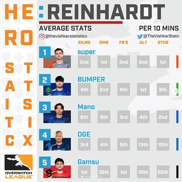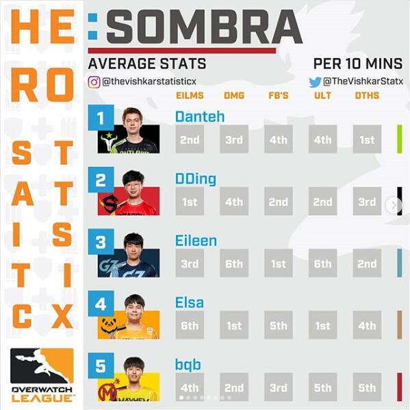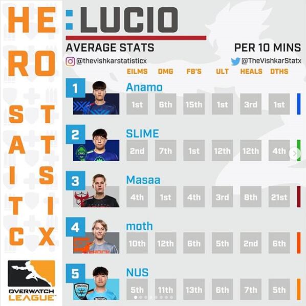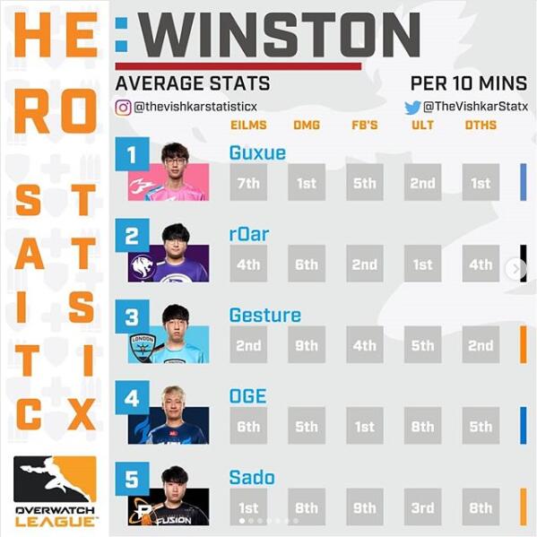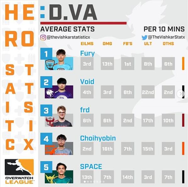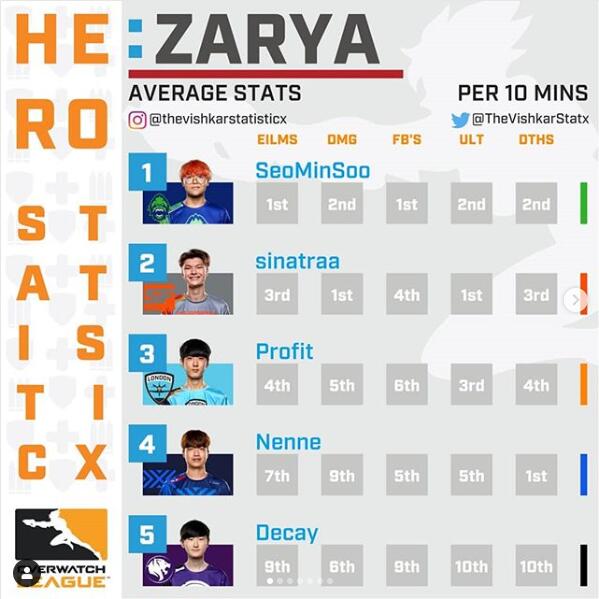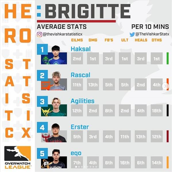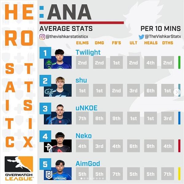 近日,一名推主在Twitter上公布了守望先锋联赛第二赛季第二阶段,一些上场率较高的英雄使用数据的选手排行榜,其中记录了英雄“安娜”、“布丽吉塔”、“查丽娅”、“温斯顿”、“黑影”、“莱因哈特”、“卢西奥”、“D.va”。综合判定排名的数据项有“消灭数”、“伤害量”、“最后一击数”、“治疗量”(辅助英雄)、“终极技能充能速度”、“死亡次数”(以上数据均为每10分钟数据)。