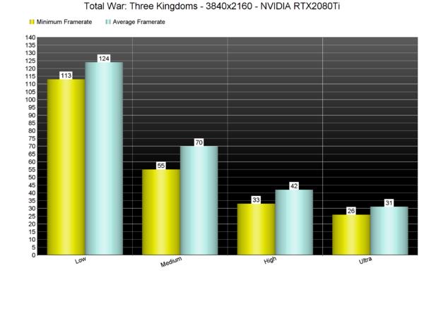 由于《全面战争:三国》是一款非常吃显卡的游戏,所以Dsogaming决定测试一下预设画质下的4K分辨率游戏。在将画质设定为“高级”以后,RTX2080Ti显卡达到了最低33帧/平均42帧的流畅度。而只有当你将画质设定为“中级”的时候,4K分辨率的《全面战争:三国》才能达到60帧的流畅度。而如果你追求100帧+的4K游戏的话,那只能将画质设定为“低级”了。