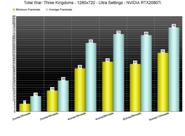 尽管此次《全面战争:三国》只支持DirectX 11 API,但在开启了超线程以后,在六核CPU和模拟的四核CPU系统下,游戏的表现都非常不错。《全面战争:三国》大多数情况下只会用到六个CPU线程,当然了如果再多两三个线程的话也能提升一些游戏表现。在1280x720分辨率下(最高画质),六核CPU的最低帧数达到了53帧,而平均帧数达到了76帧,对于一款策略游戏来说,这已经很棒了。