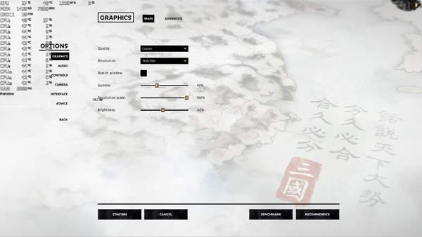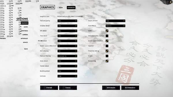 此次《全面战争:三国》中包含了诸多可供调节的画面设定选项,包括:贴图品质、阴影效果、VFX、树木效果、作战单位效果、材质贴图过滤效果、抗锯齿、地形地势效果、草的效果、建筑物效果、作战单位规模、后期调整效果和景深,此外你还可以关闭/打开一些游戏特效,比如:屏幕空间反射、屏幕空间阴影、SSAO、Vignette、邻近衰减和锐化。