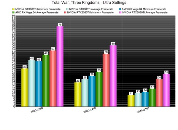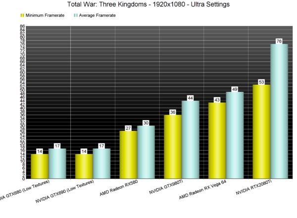 但有点出乎意料的是,作为一款策略游戏,即使只是在1920x1080分辨率下(最高画质),《全面战争:三国》对显卡的要求也非常高。在1080P下,Dsogaming的Radeon RX580显卡最低帧数只有27帧,而平均帧数也只有30帧,而即使是Radeon RX Vega 64也无法达到60帧的游戏体验。在此次测试的显卡中,只有RTX2080Ti显卡才能提供流畅的游戏体验。