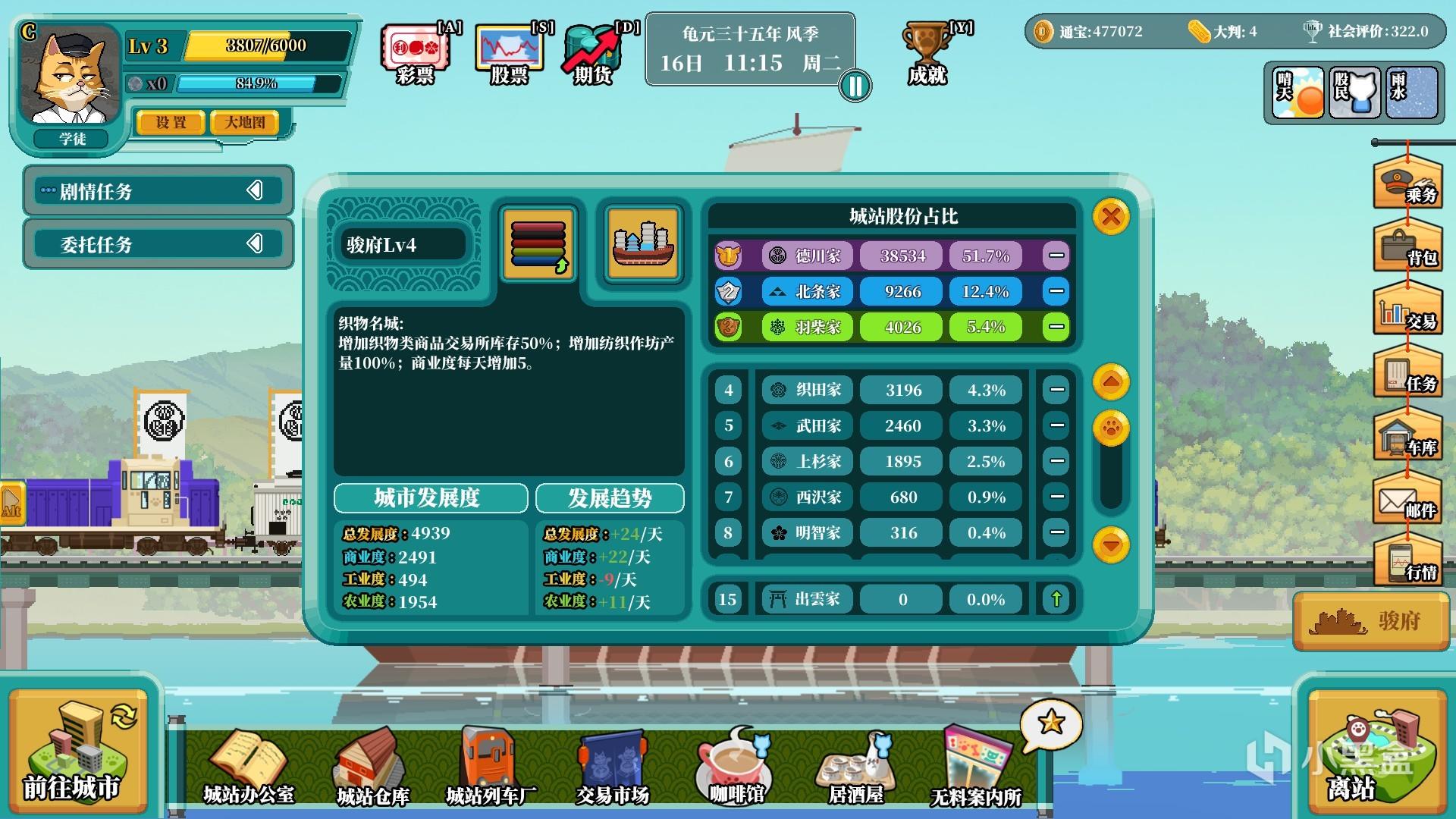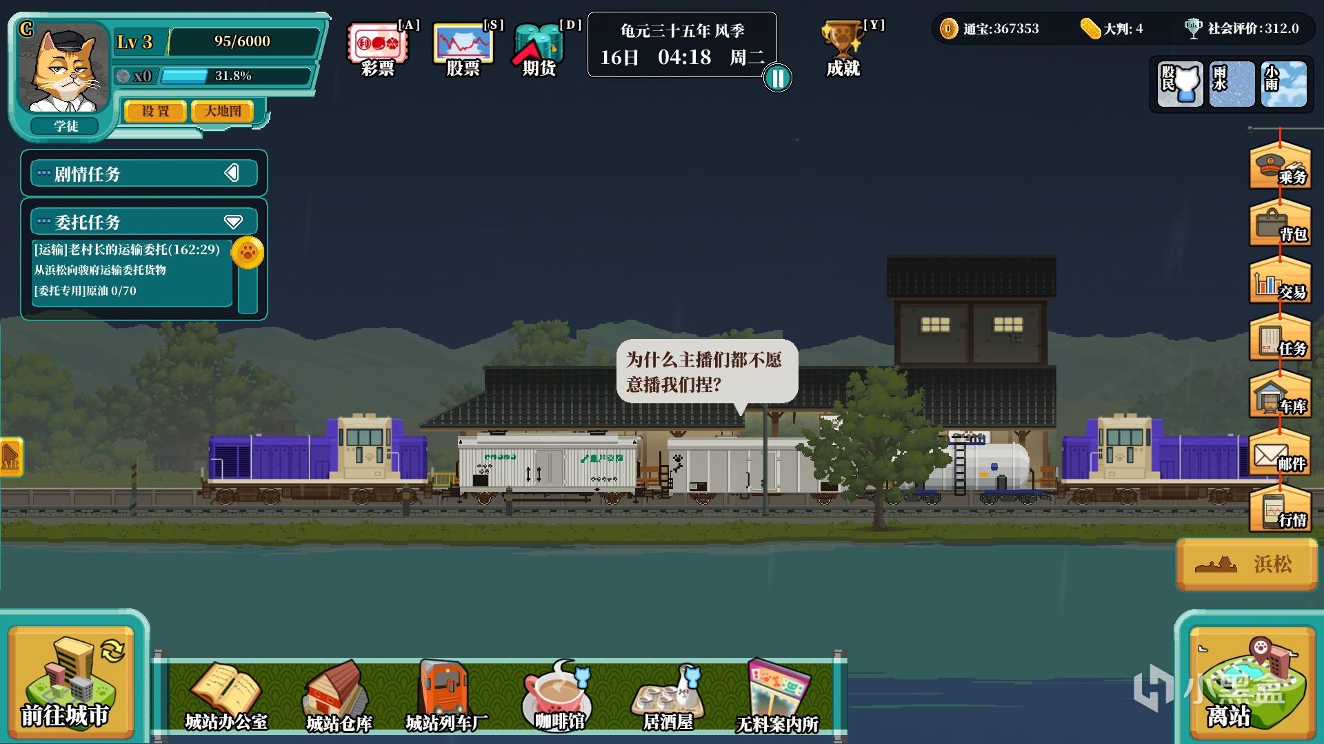 虽说这是一款像素休闲游戏,但是该有的元素一样不少,很多系统看着还蛮写实的。不同的城市随着时间变动(游戏内空格键可以暂停)会有不同的流行元素,这也会为货运和客运带来各种各样的增益或者减损(例如一个城市一段时间内很追捧瓷器,瓷器便会涨价)。