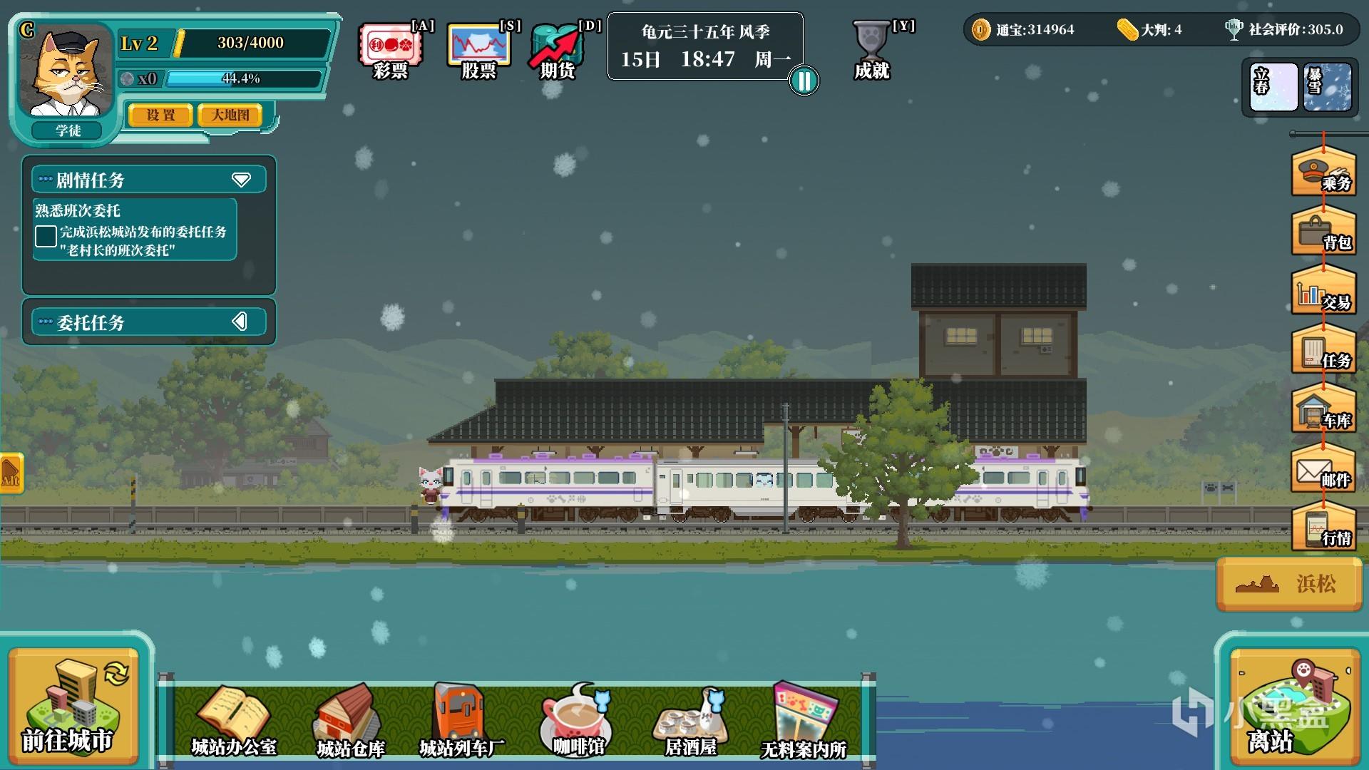 游戏是2D平面的像素游戏,当玩家接到一个运载合同后,便可以点击离站进入大地图模式,然后点击目的地即可。游戏内有动态的天气系统,BGM也相当令人放松愉悦,道路两旁还有随地点变化的景物。听着轻快的音乐,伴随着淅淅沥沥的雨点坐在火车上,这种恬淡闲适的旅途真的蛮令人向往的。