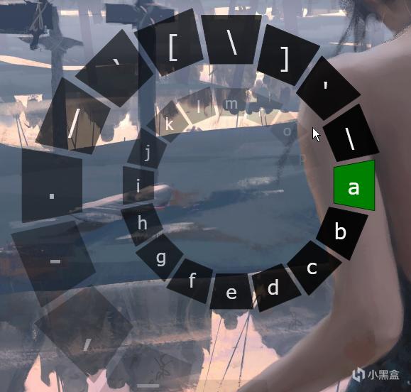 看到这里或许就会有人要问了,“那我们难道还能用手柄来打字吗?”答案当然是肯定的,在使用预设键位的情况下,按下左摇杆键即可触发虚拟键盘:如下图所示。我们可以旋转左摇杆来选择需要的字母 数字 甚至是特殊字符,非常的方便好用。